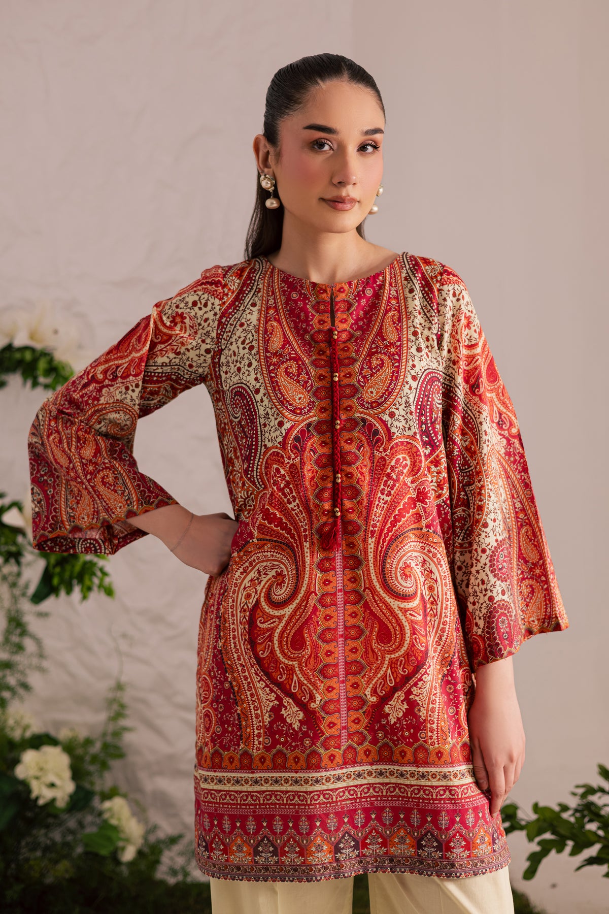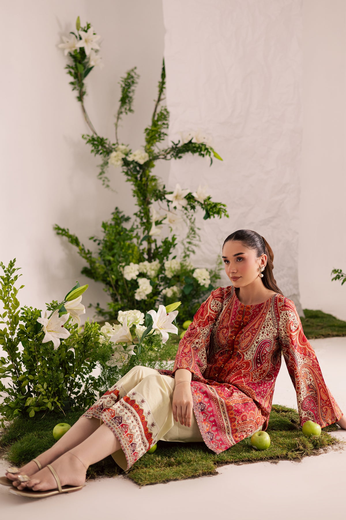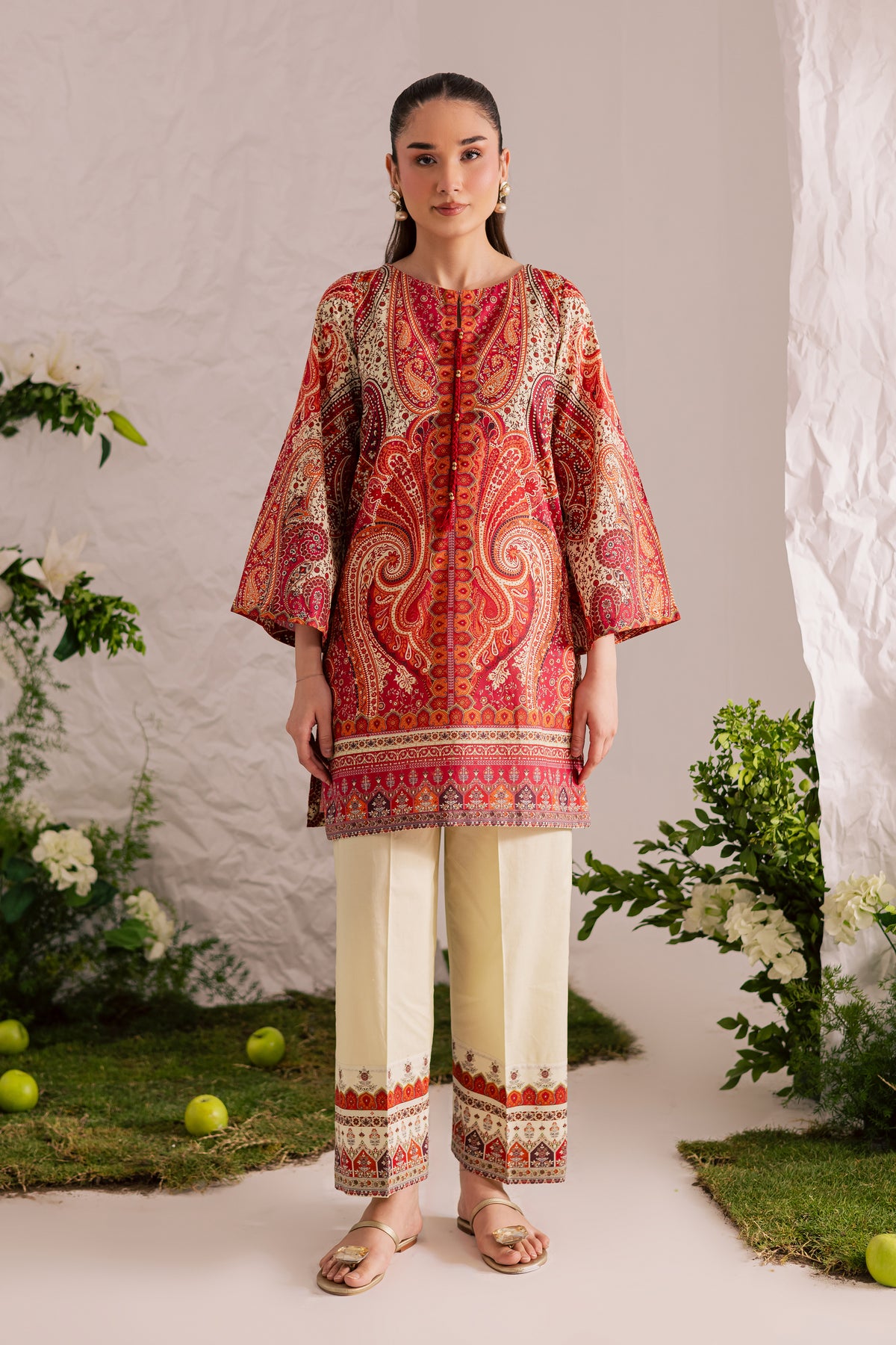 This red color lawn digital printed short-length shirt features slight embellishments on the neckline, adding a touch of understated elegance to the vibrant print.