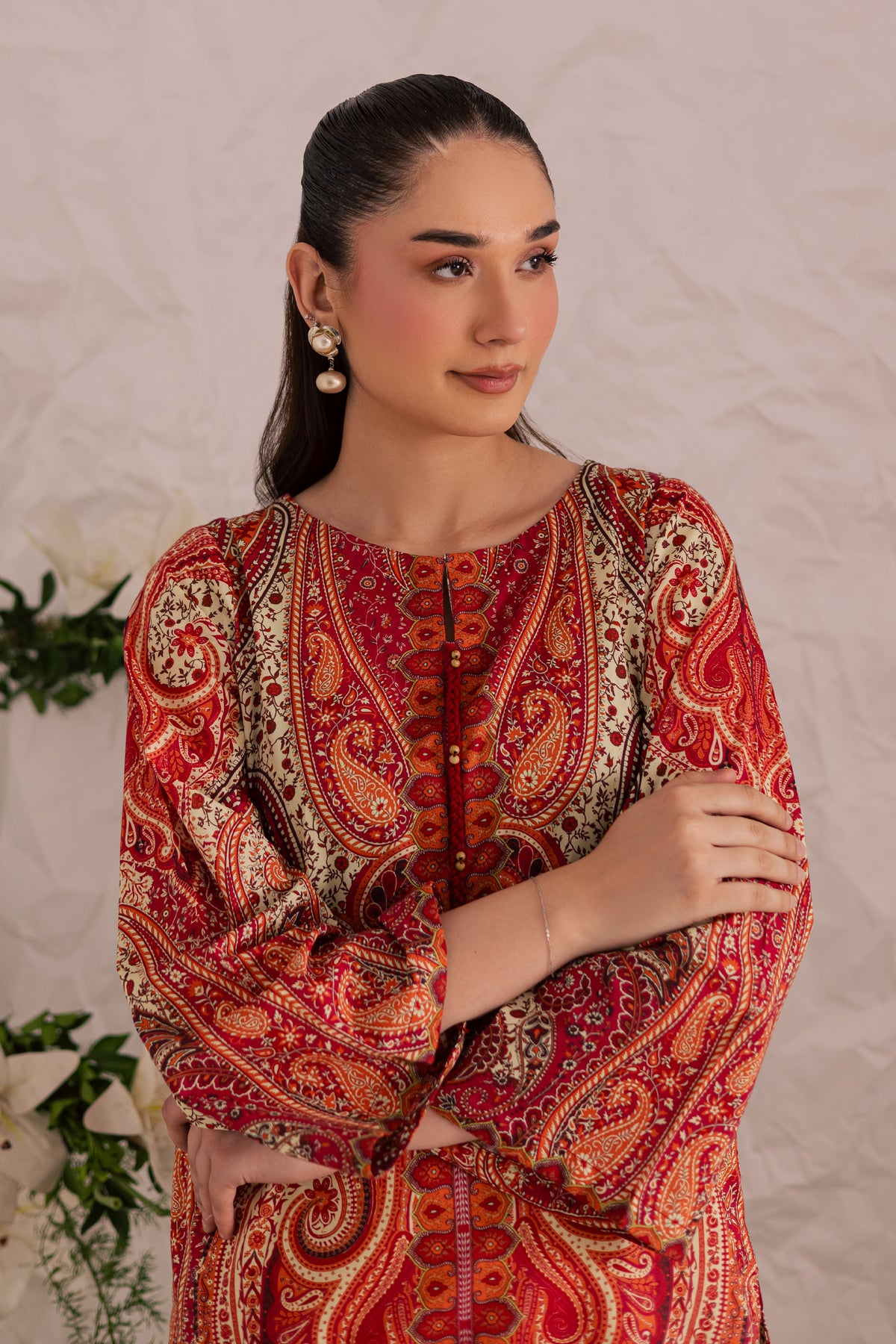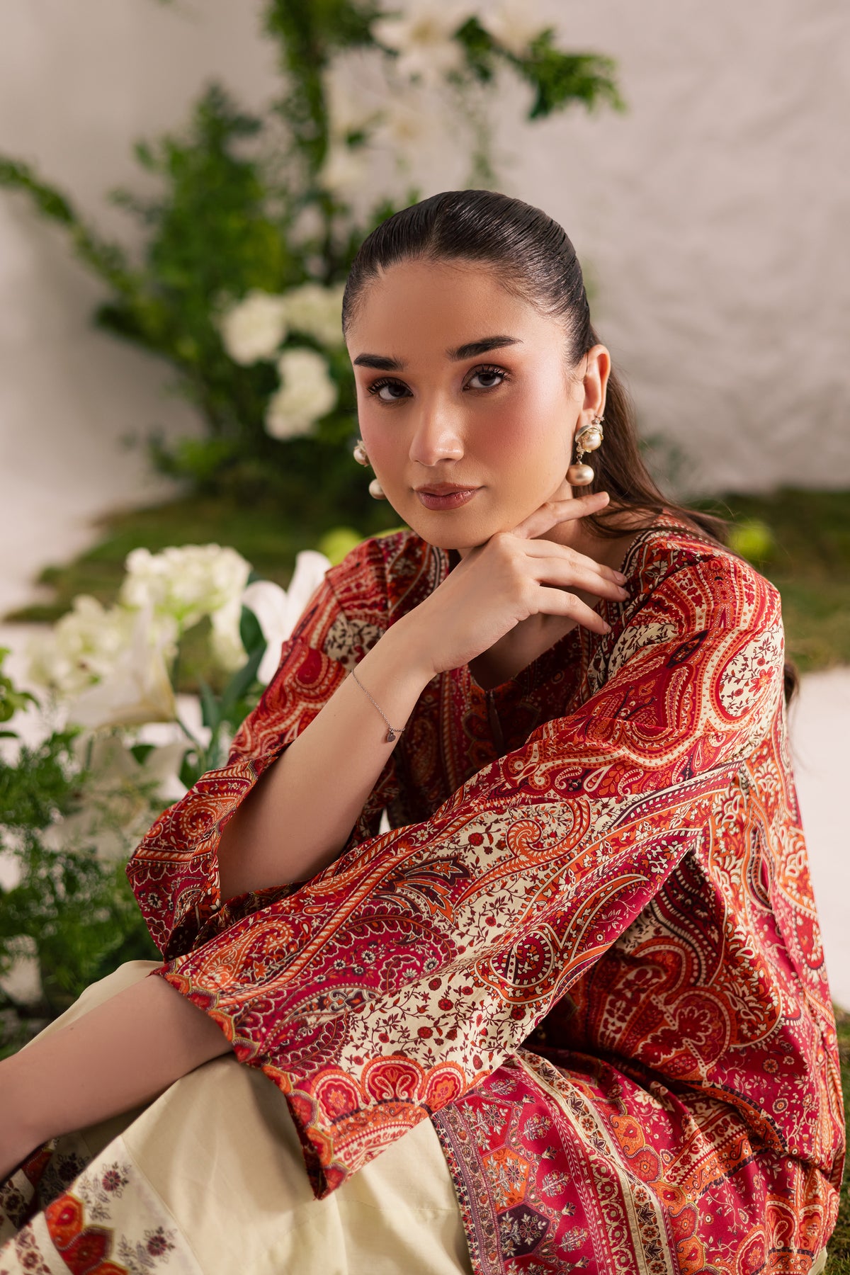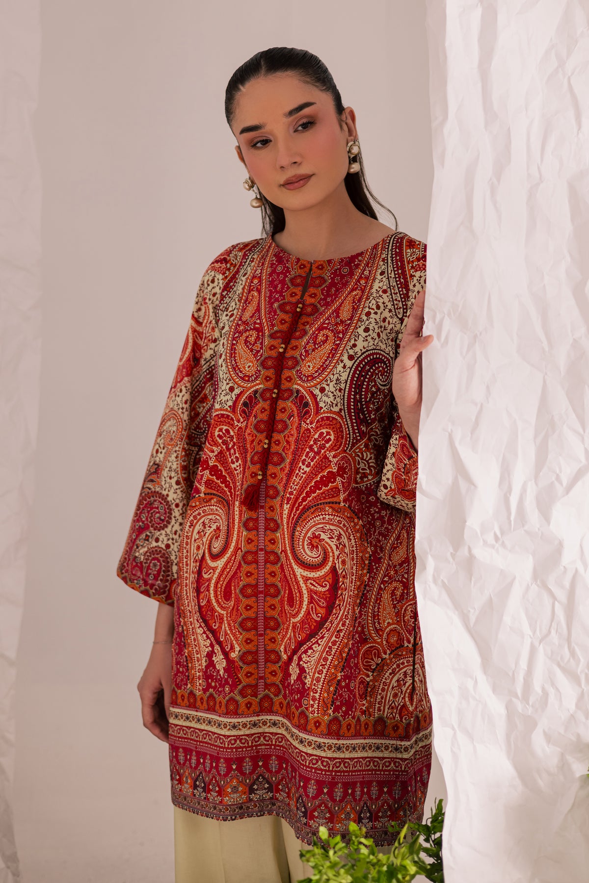 This red color lawn digital printed short-length shirt features slight embellishments on the neckline, adding a touch of understated elegance to the vibrant print.
