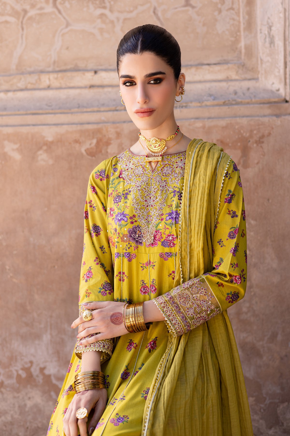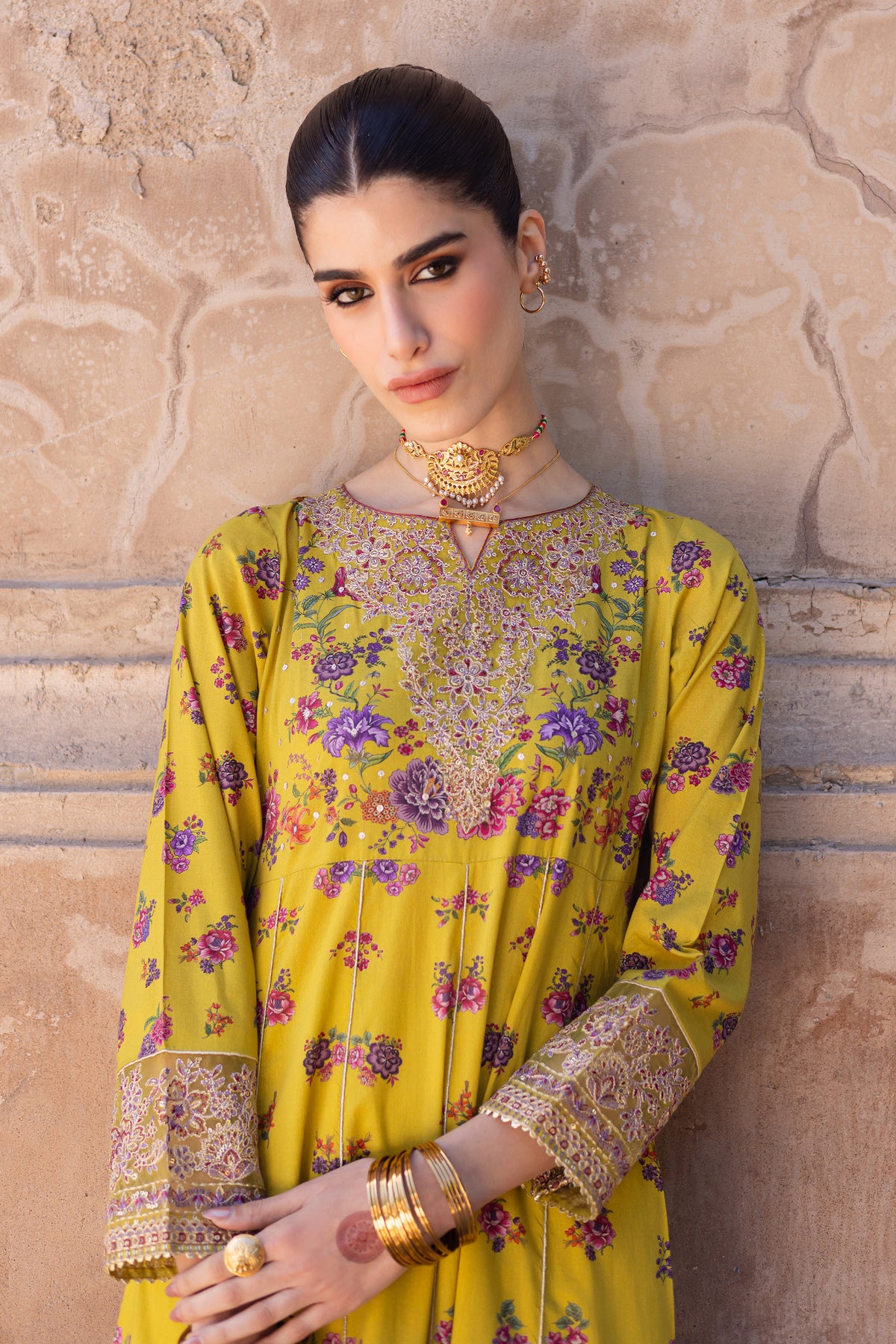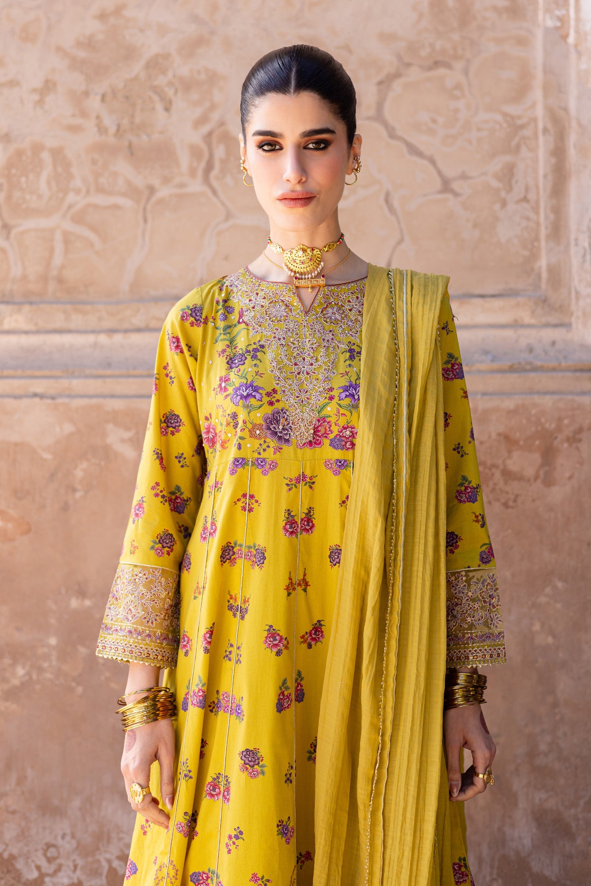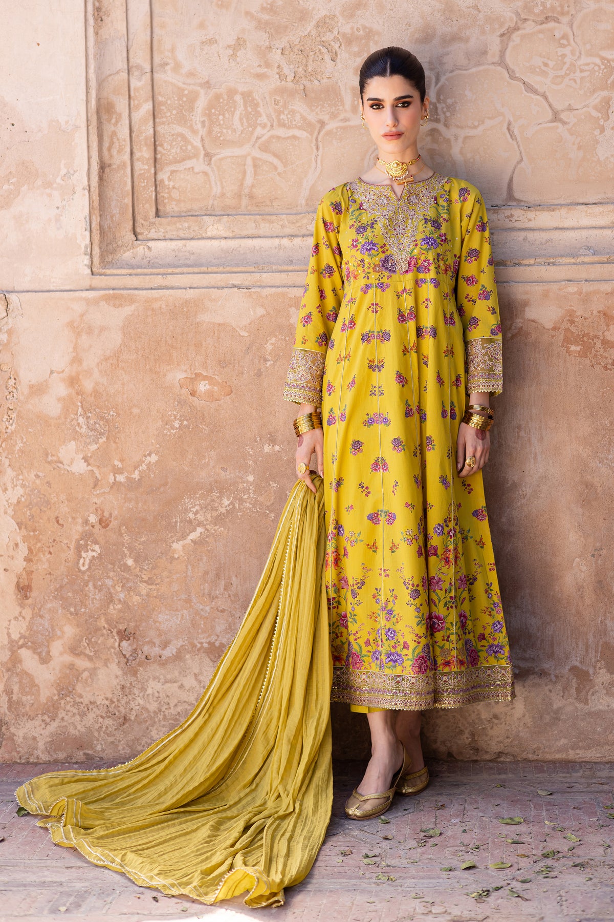 This printed composed panelled yellow lawn frock is beautifully designed with intricate embroidery at the neckline, sleeves, and hem, offering a sophisticated and elegant touch. The lace detailing at the hem adds a delicate finishing touch to the overall design.