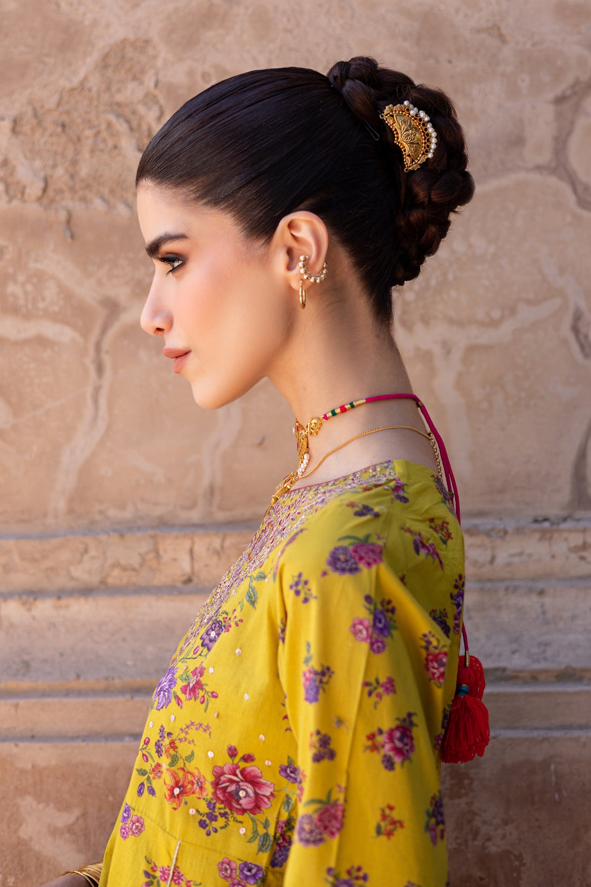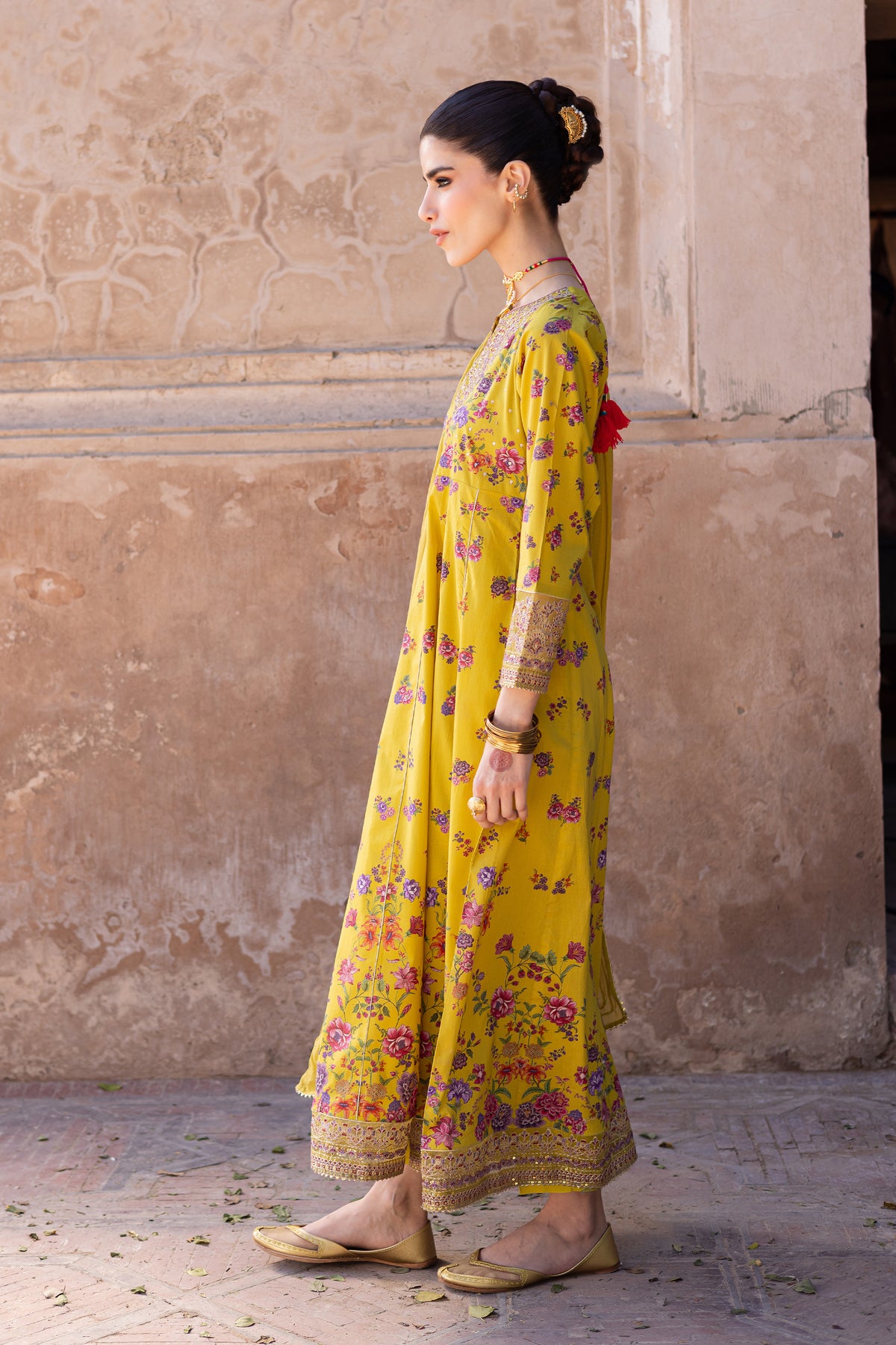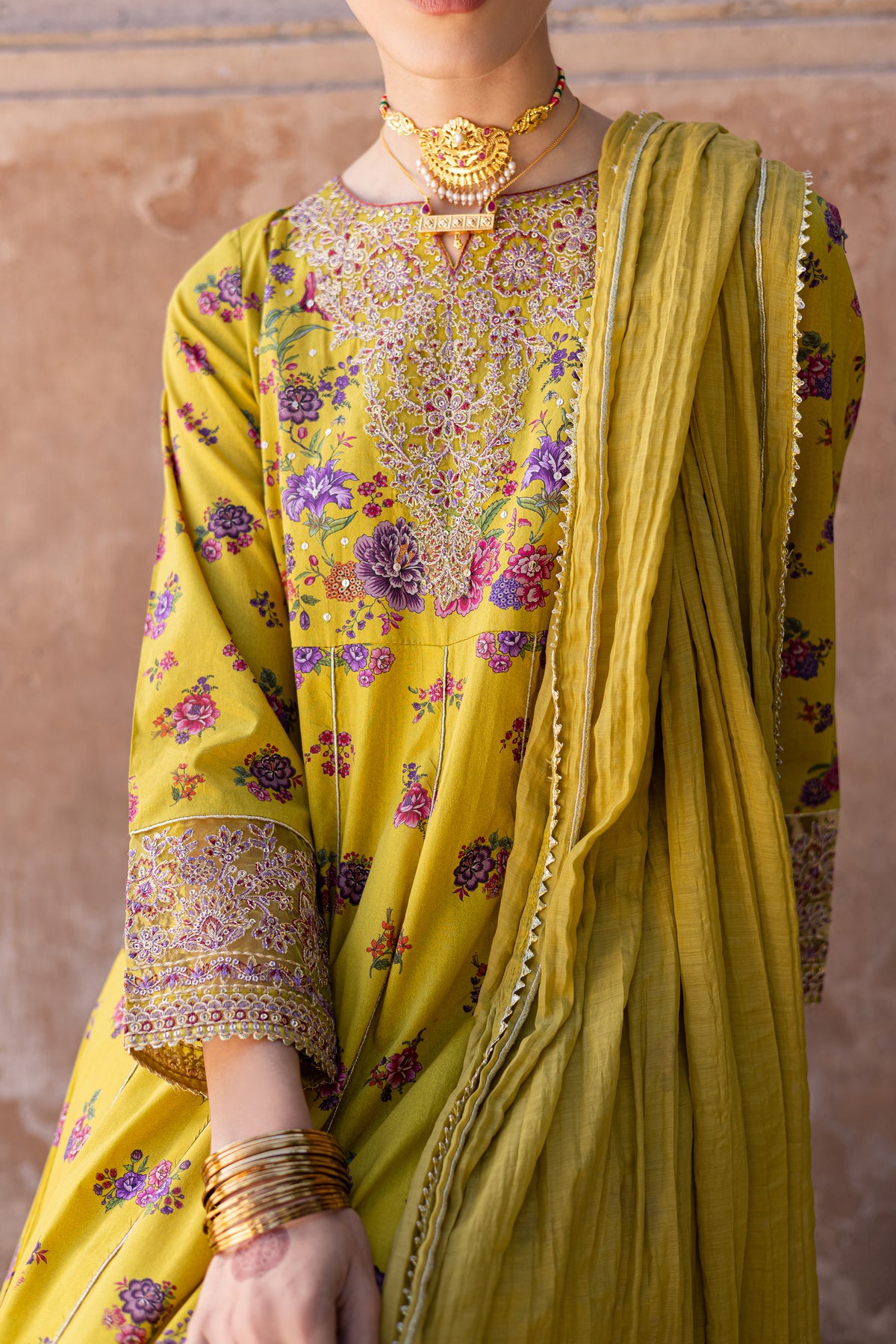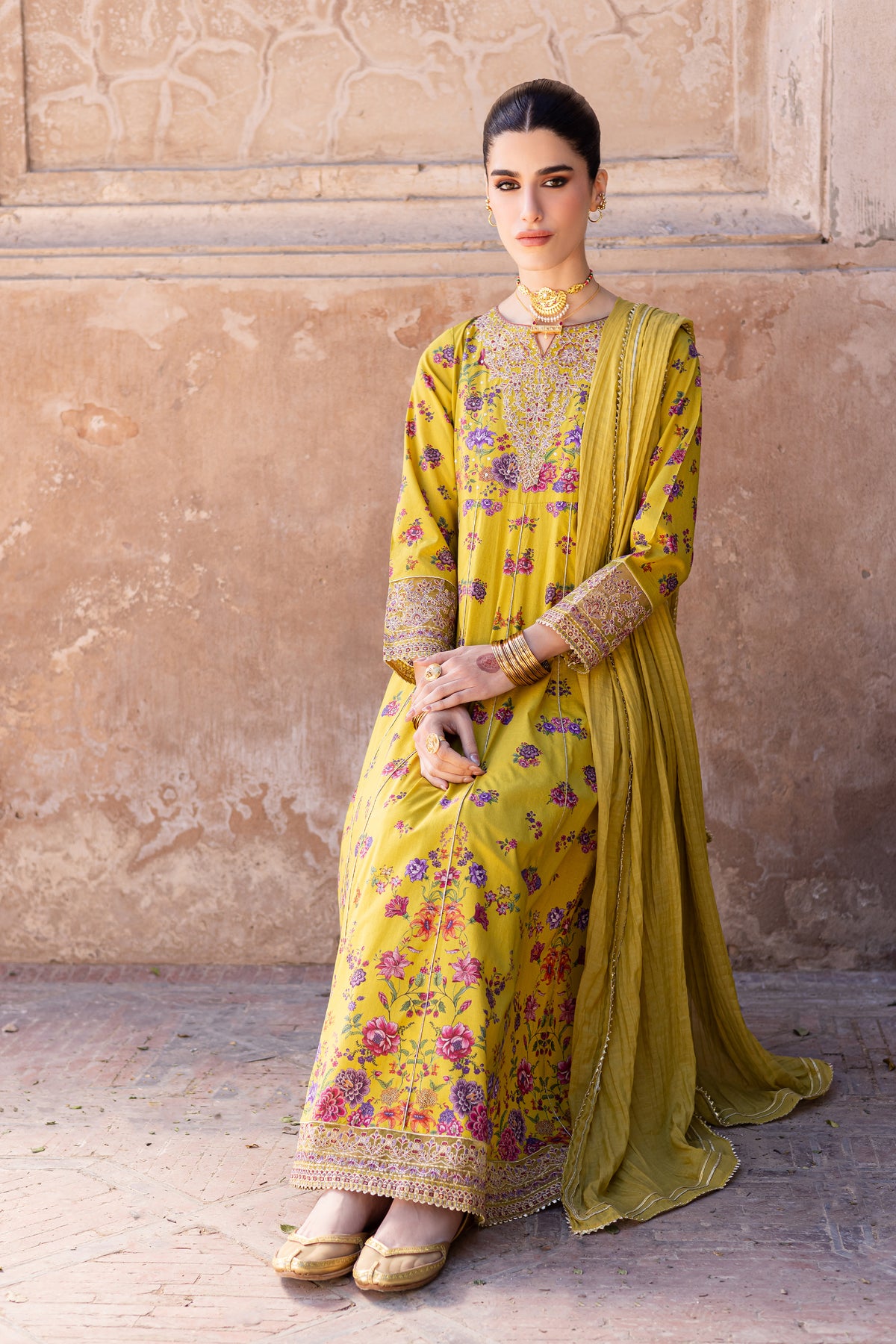 This printed composed panelled yellow lawn frock is beautifully designed with intricate embroidery at the neckline, sleeves, and hem, offering a sophisticated and elegant touch. The lace detailing at the hem adds a delicate finishing touch to the overall design.