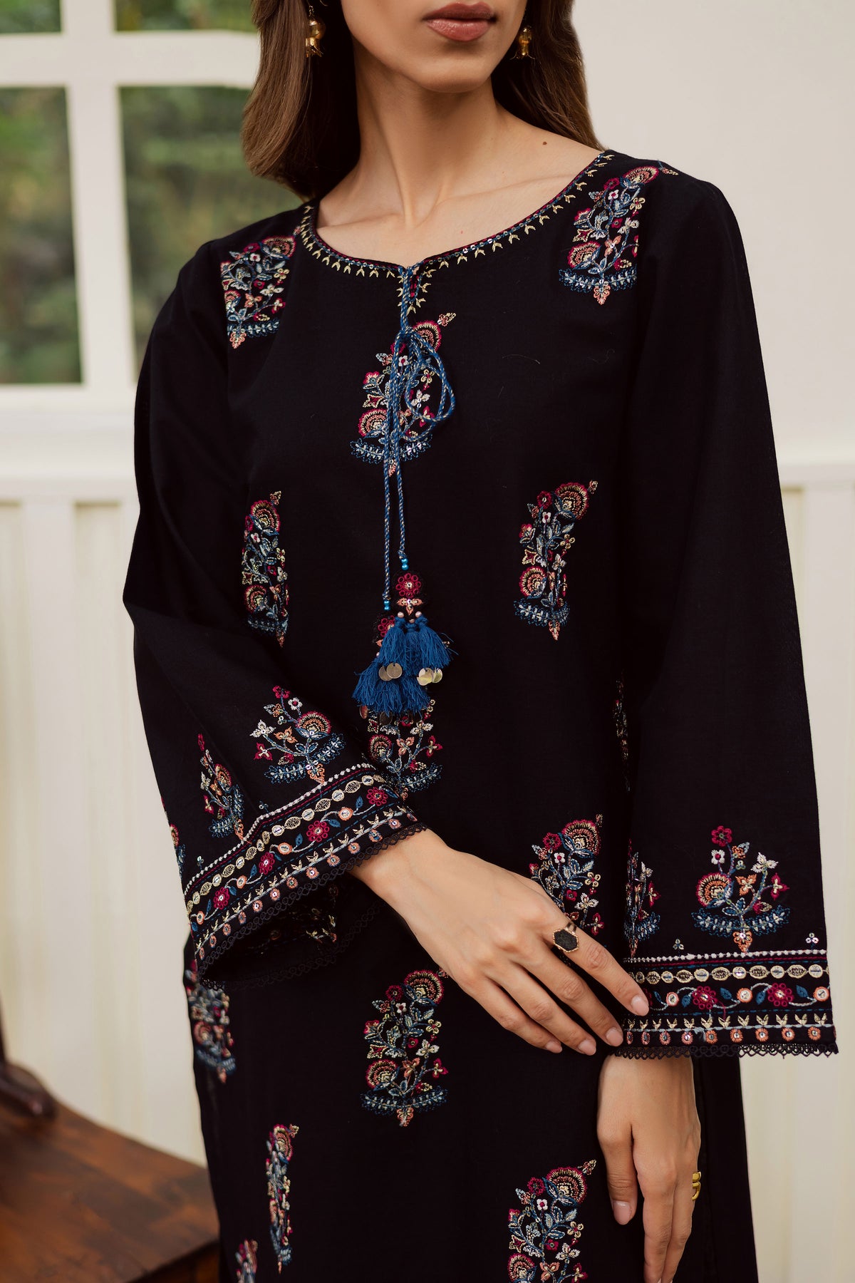 This 2-piece black khaddar ensemble is all about effortless elegance with a cozy winter feel. The shirt features a fully embroidered front, beautifully finished with tassels and lace that add a touch of charm and detail. Its intricate design and soft texture make it a perfect choice for both everyday wear and casual gatherings.