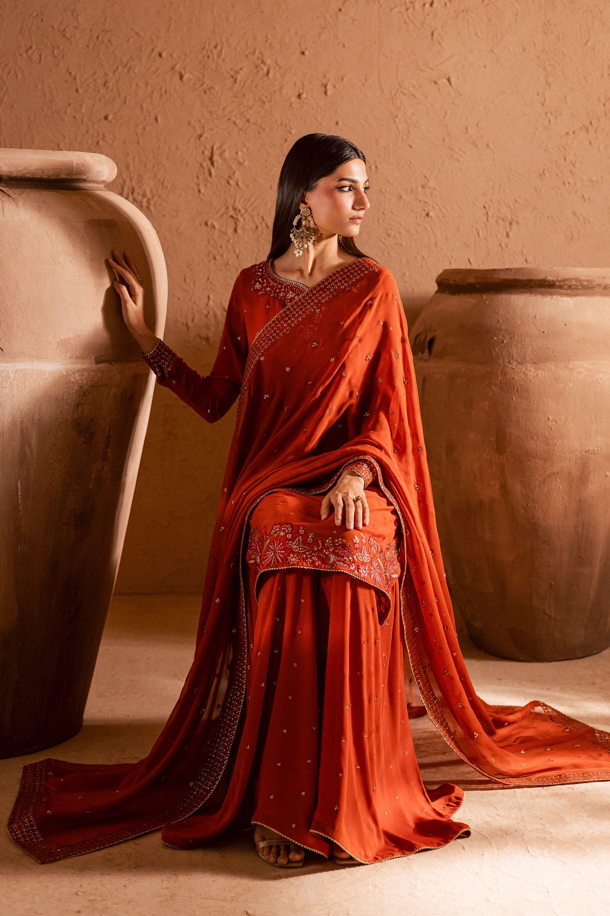This burnt orange ensemble features a short shirt and gharara, adorned with a composed embroidered hem and an adda worked neckline. The shirt front and sleeves carry a fine sequin spread, while embroidered sleeve borders add structure and charm.