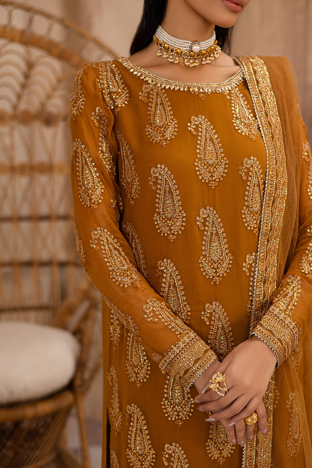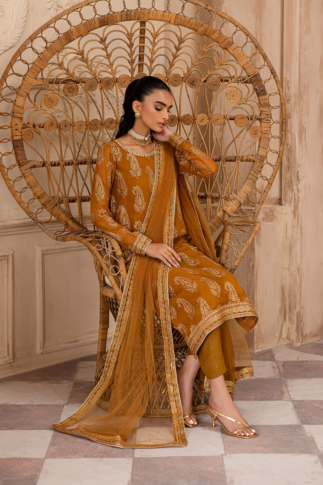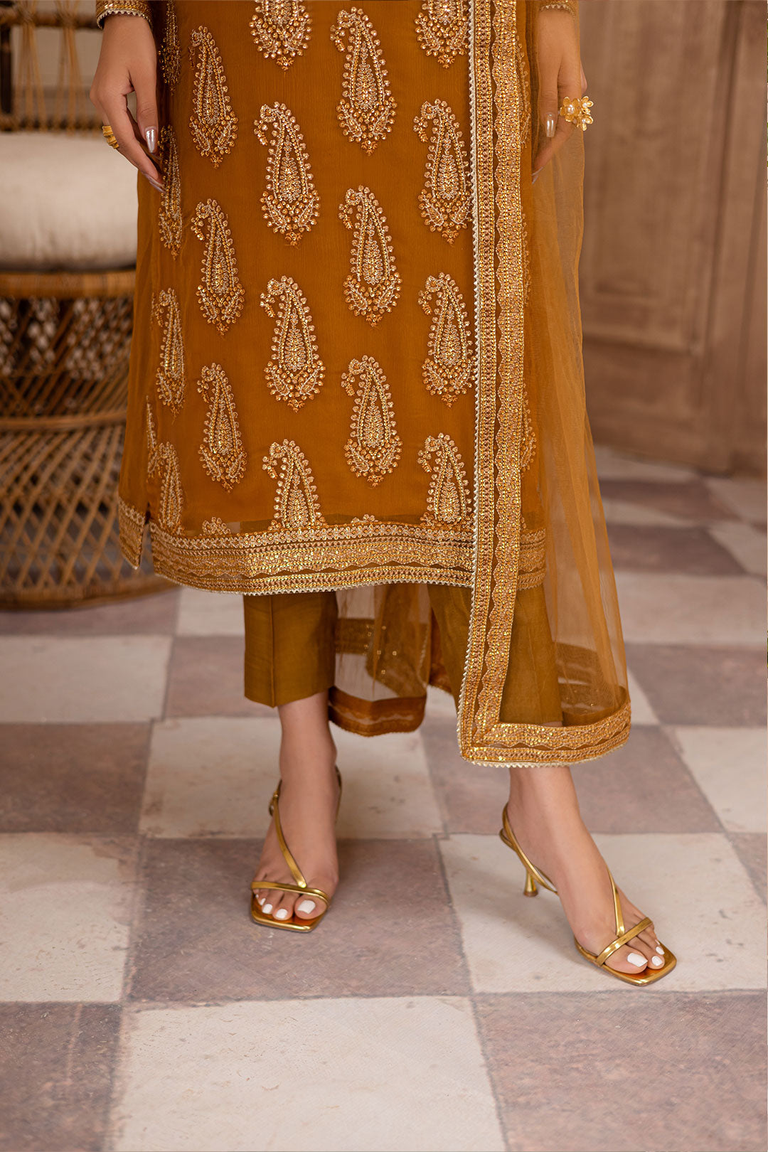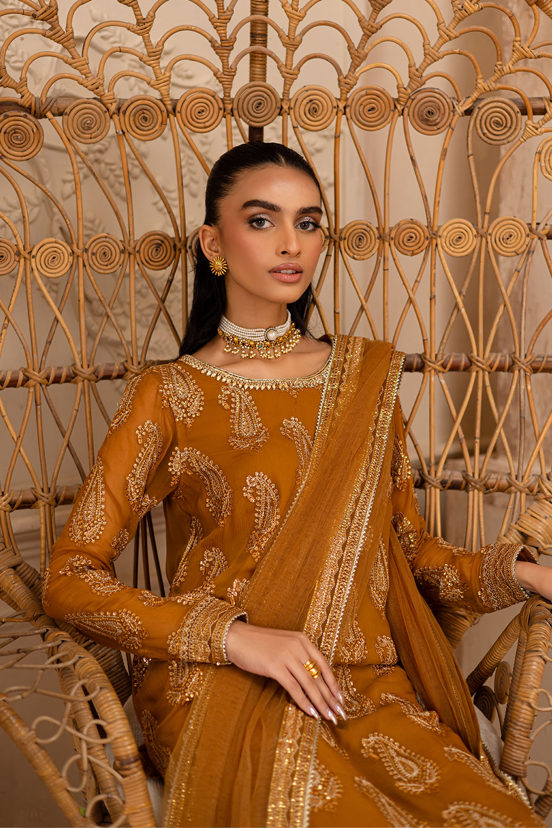 The look is completed with a net dupatta, adorned with embroidered borders on all four sides, providing a delicate and sophisticated finish that elevates the outfit.