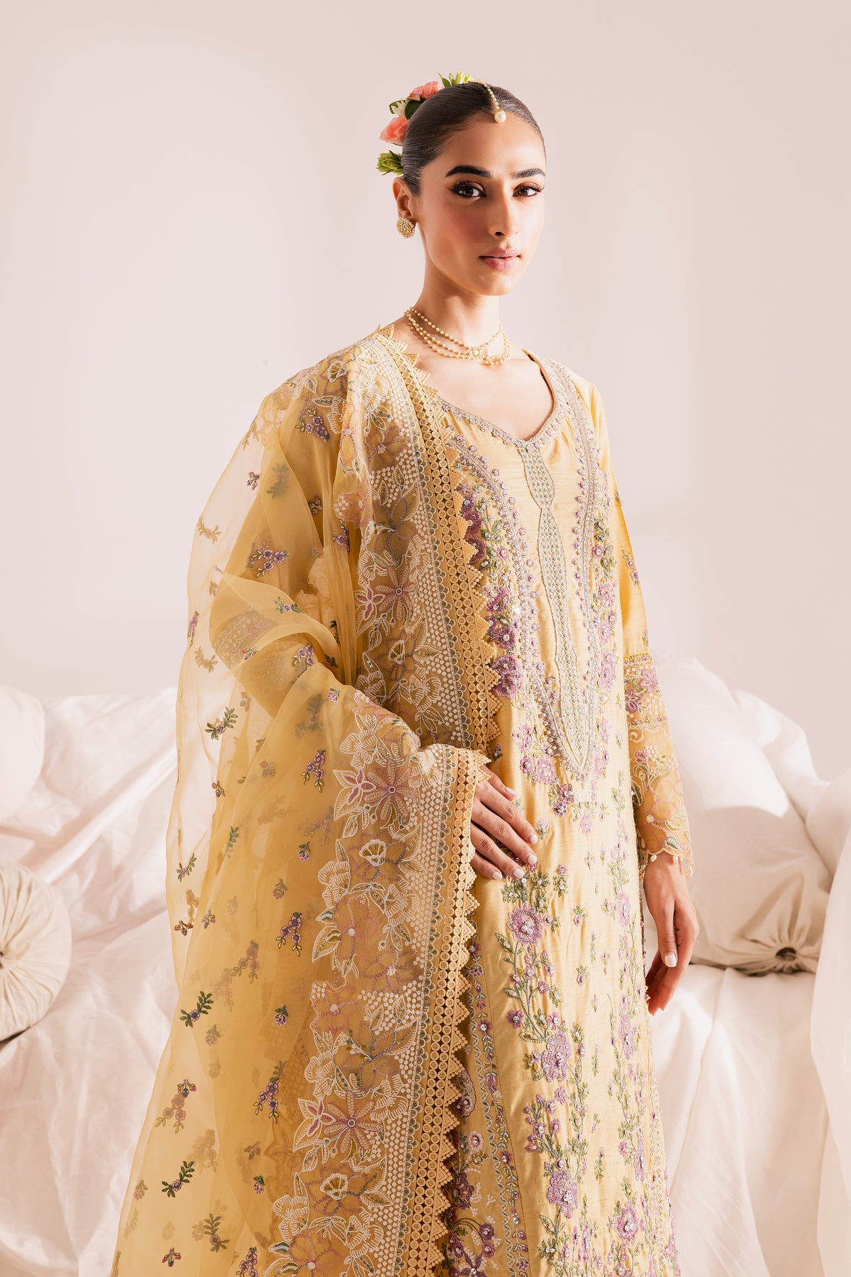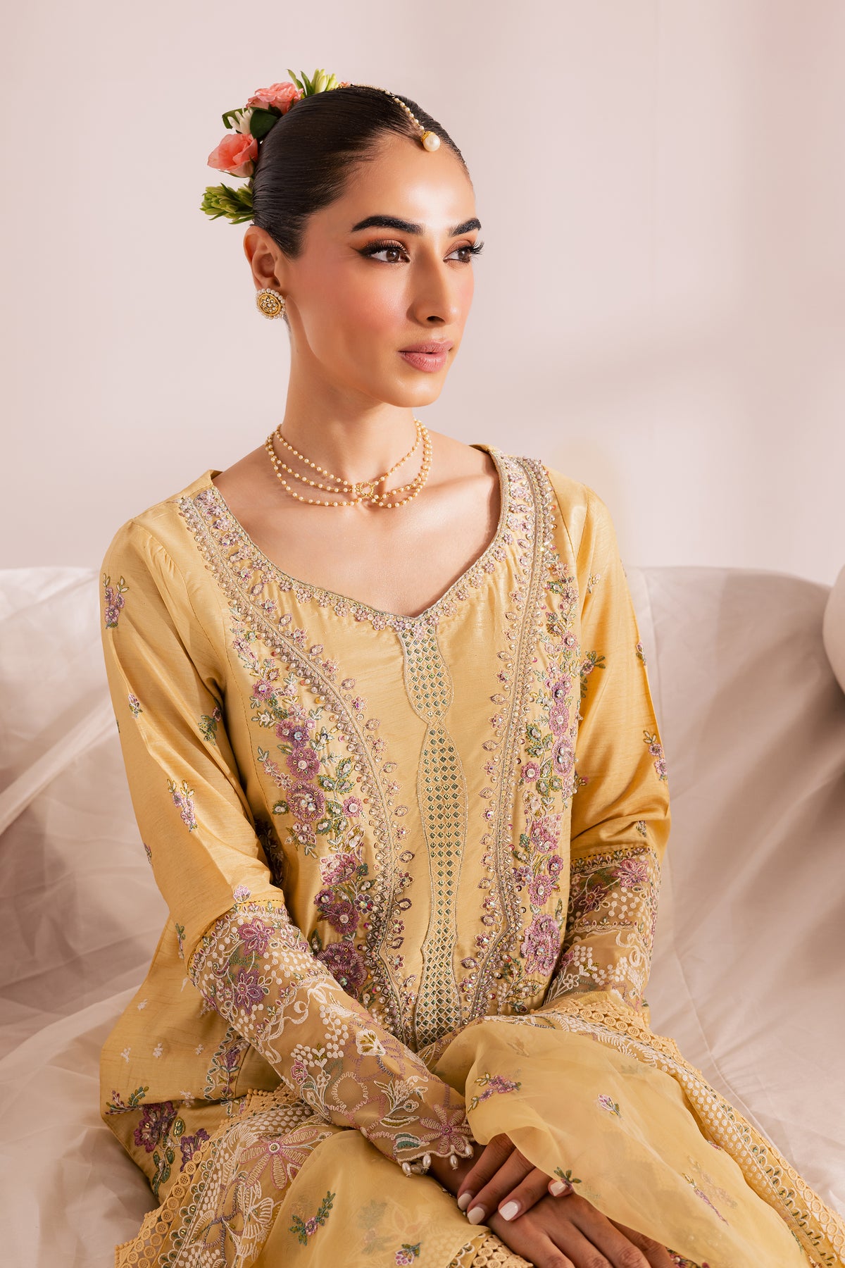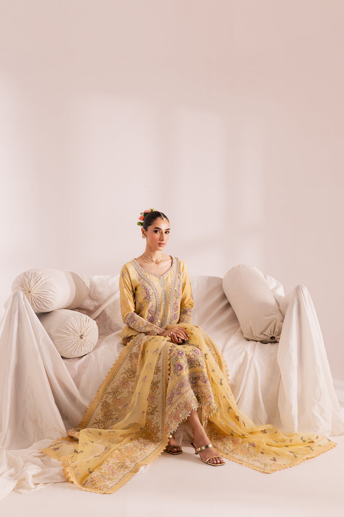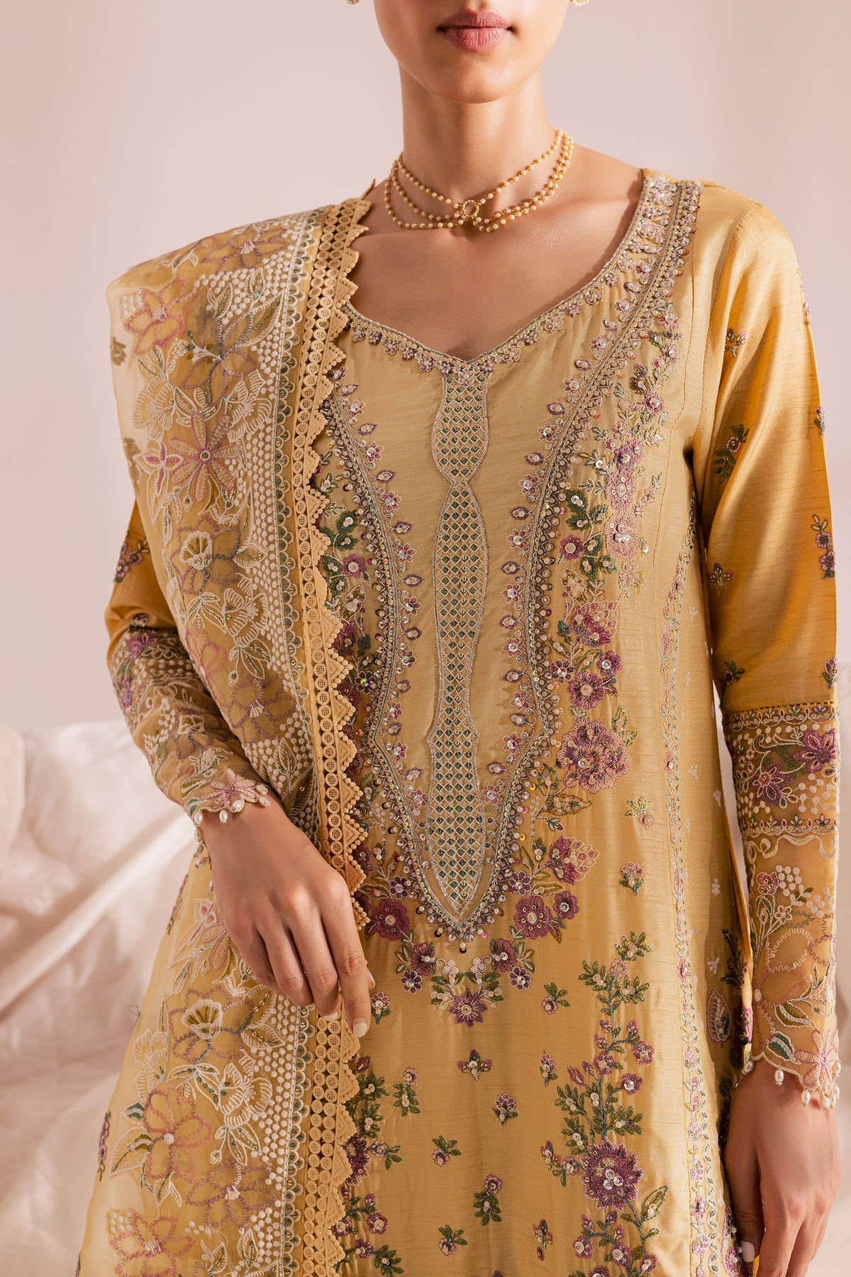 This dreamy ensemble in pastel yellow raw silk, featuring a shirt divided into three panels with elegant composed embroidery and borders finished with serhi lace. The neckline is adorned with intricate hand embellishments—pearls, crystals, and sequins—adding dimension and richness. The hemline is completed with delicate crystal hangings for a graceful finish. The sleeves are embroidered with matching borders and finished with pearl hangings at the cuffs, attached using serhi lace.
