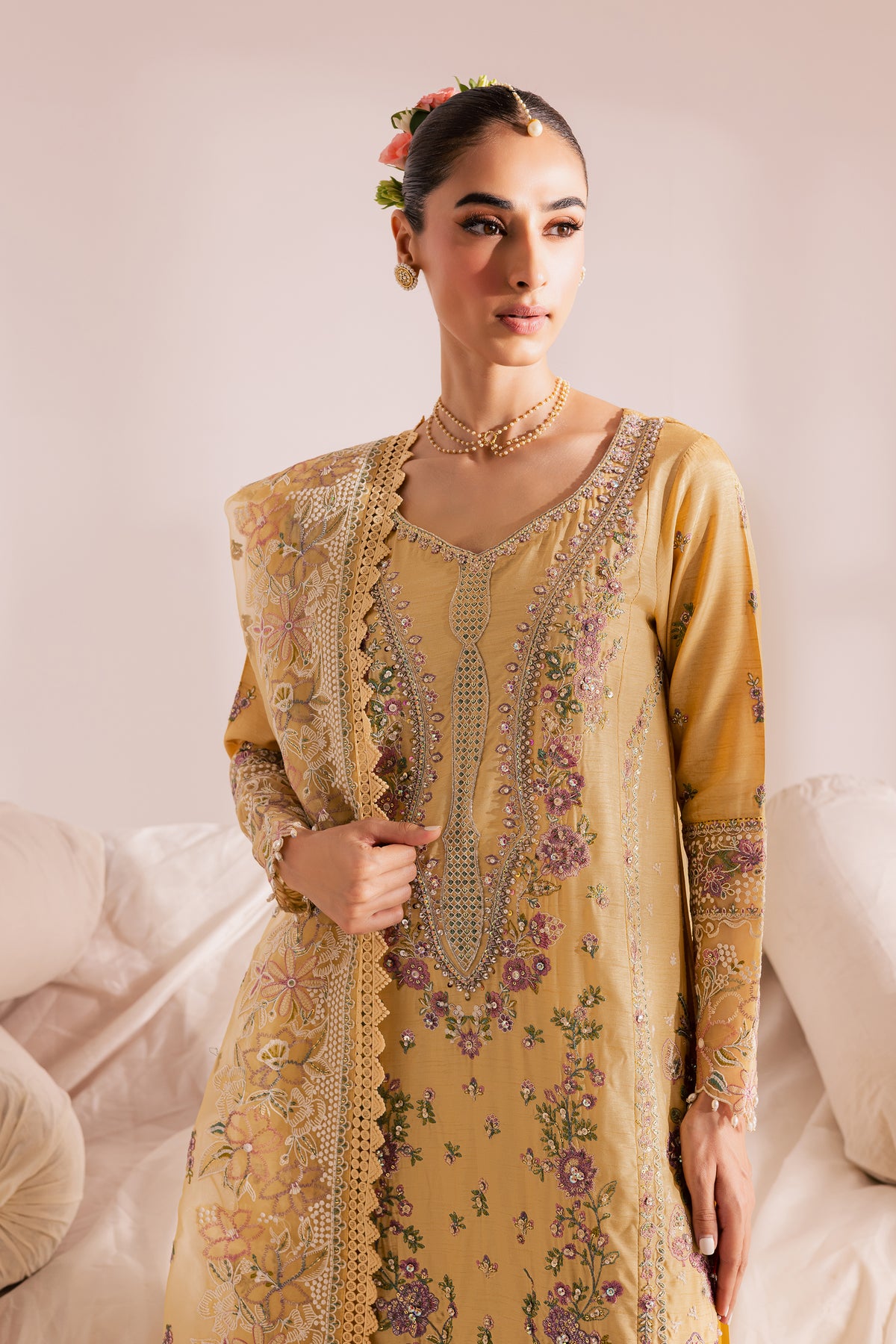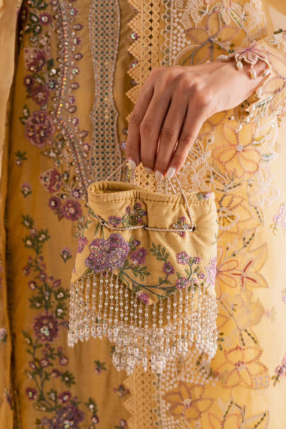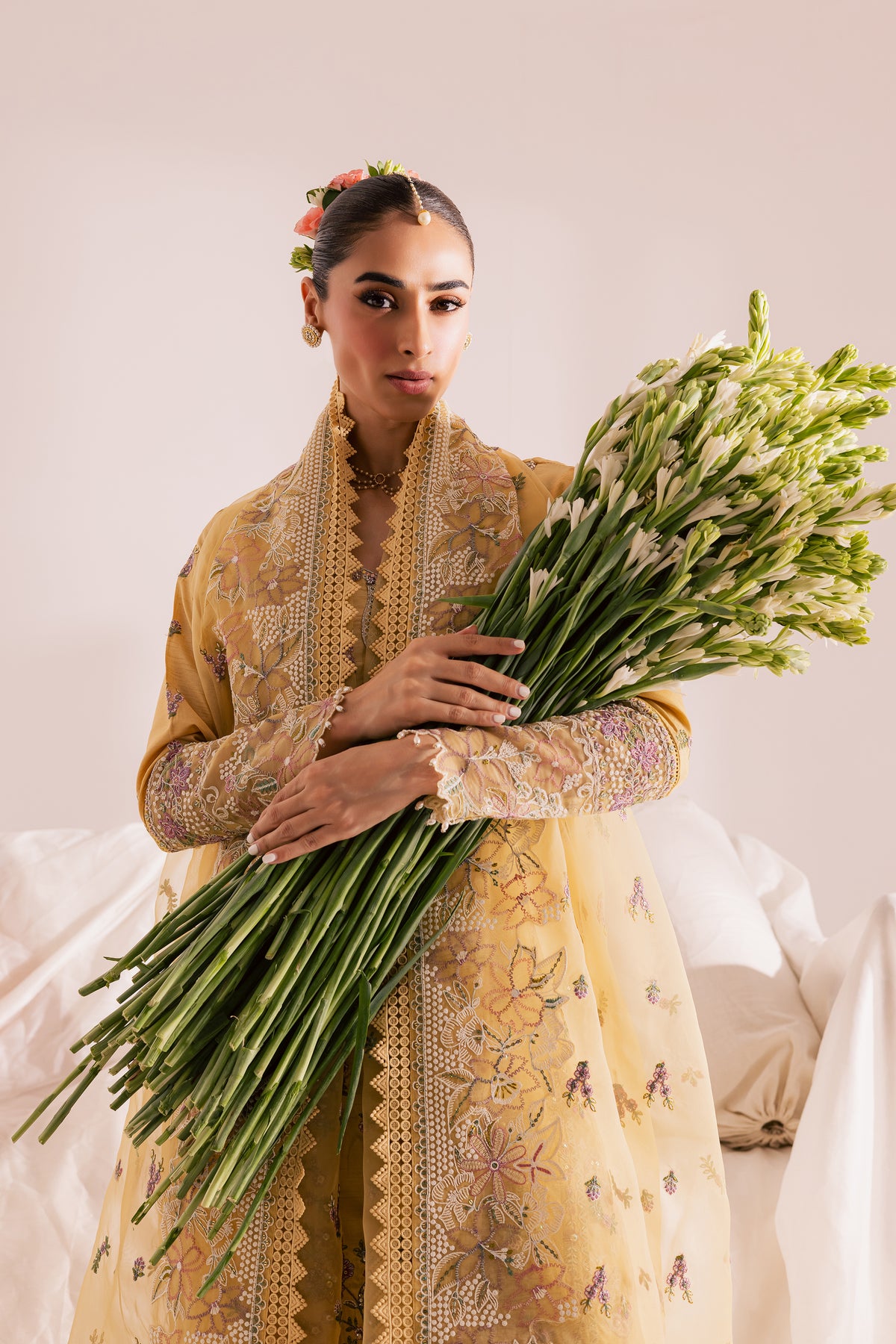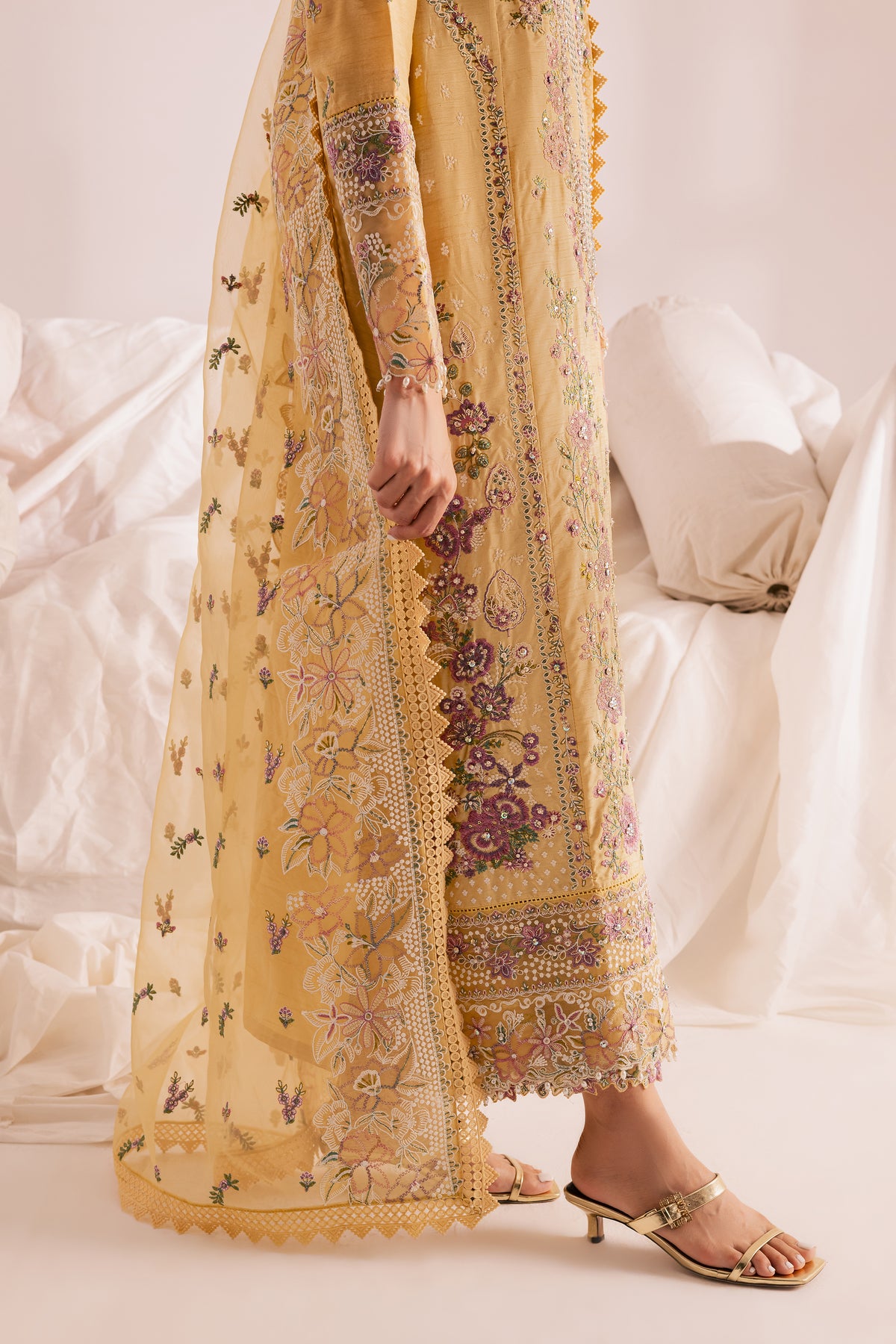 This dreamy ensemble in pastel yellow raw silk, featuring a shirt divided into three panels with elegant composed embroidery and borders finished with serhi lace. The neckline is adorned with intricate hand embellishments—pearls, crystals, and sequins—adding dimension and richness. The hemline is completed with delicate crystal hangings for a graceful finish. The sleeves are embroidered with matching borders and finished with pearl hangings at the cuffs, attached using serhi lace.