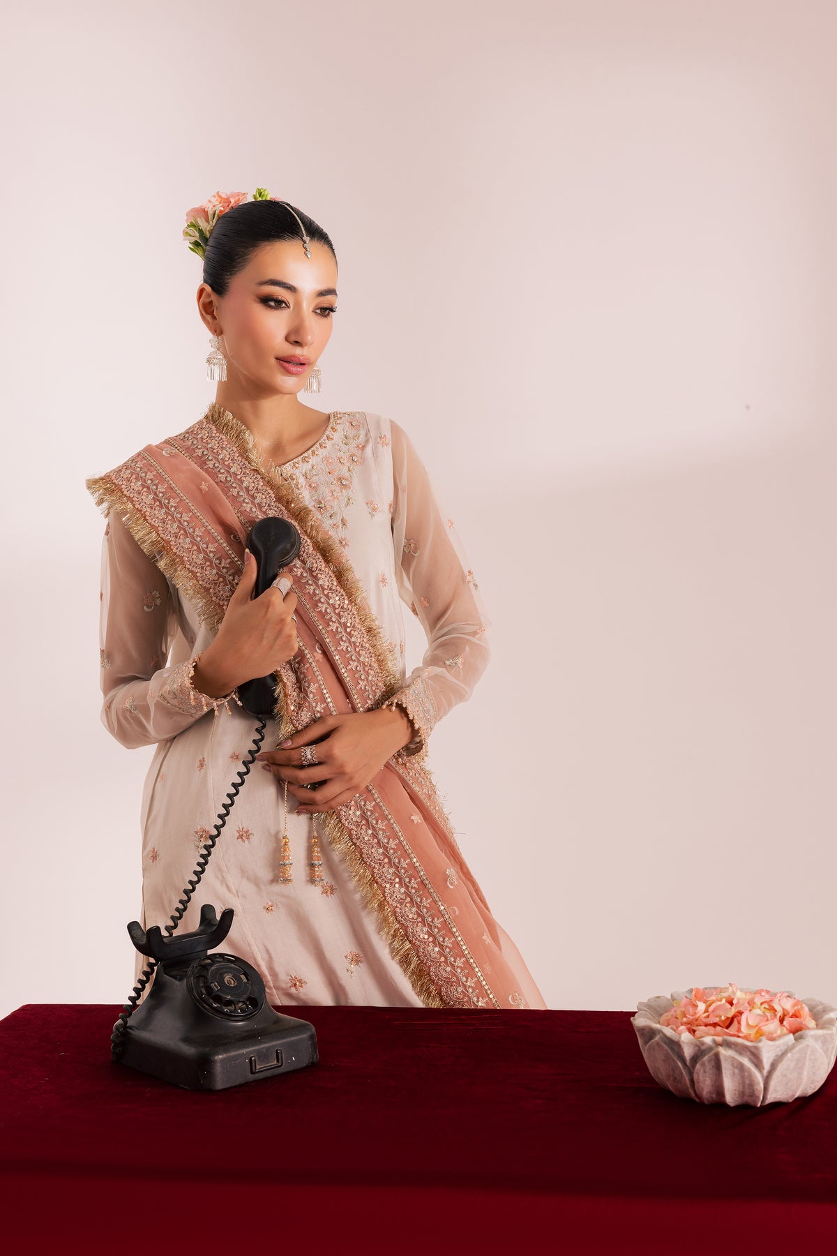 The look is completed with a contrasting peach organza dupatta, featuring all-over embroidery, four-sided borders, and a classic Kiran lace finish.