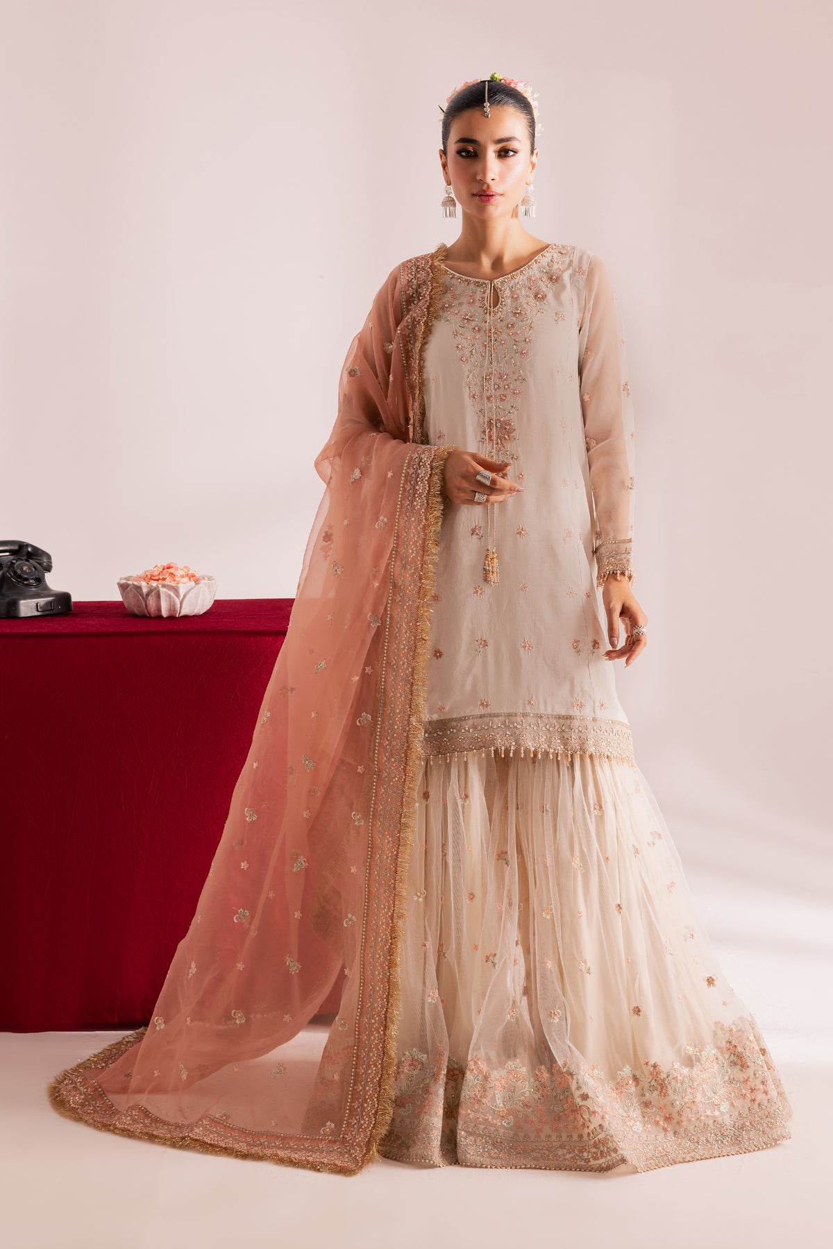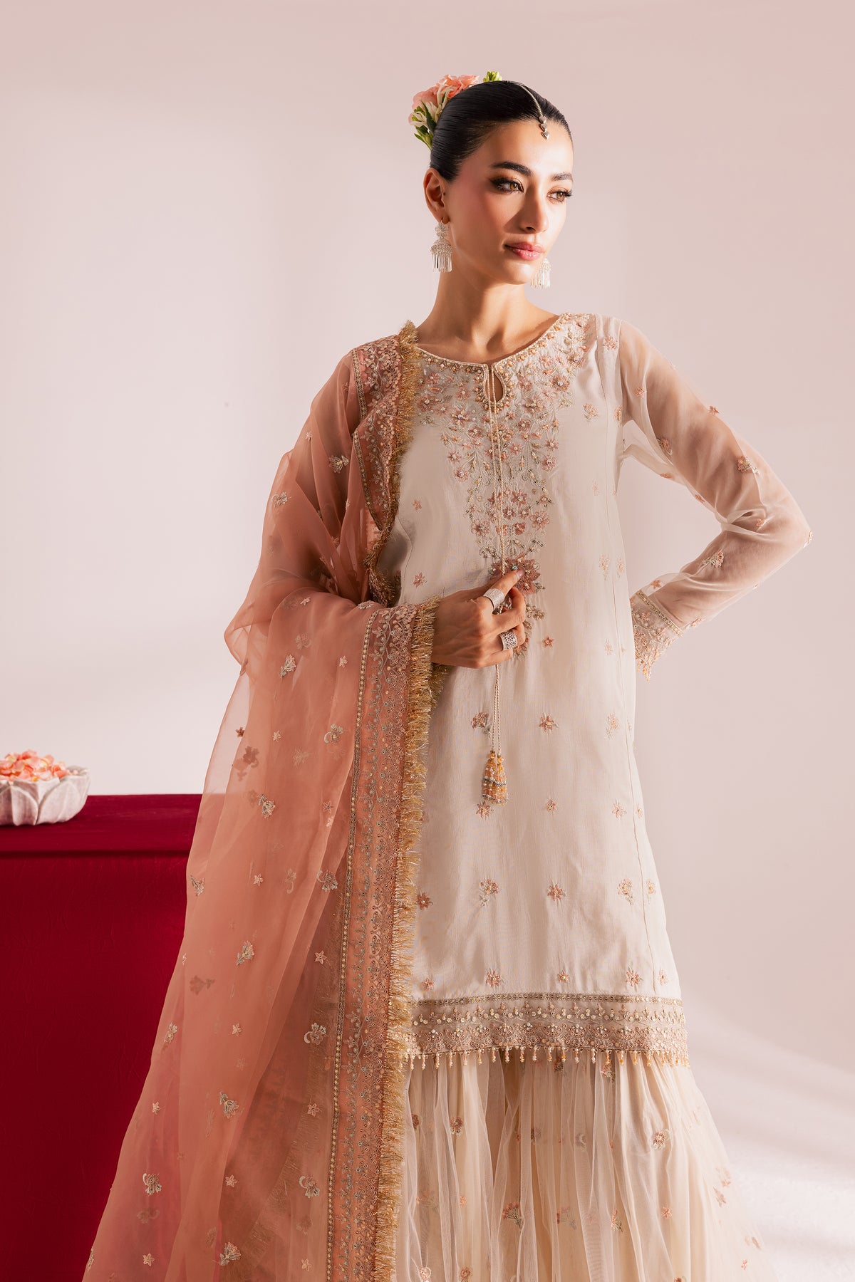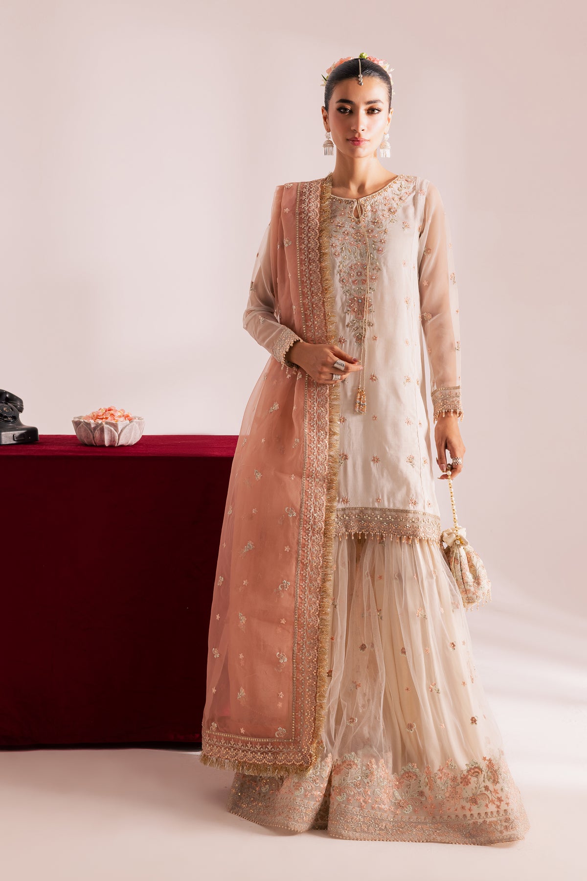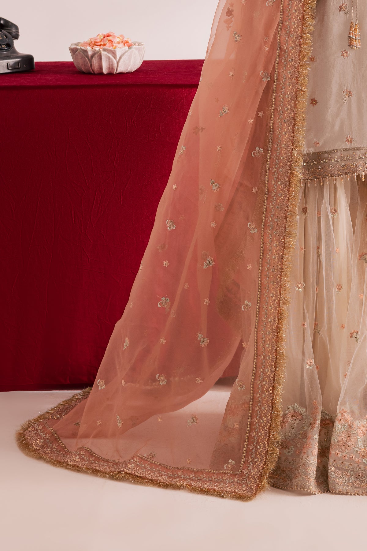 Paired with an embroidered net gharara, detailed with elegant embroidery and finished with lace.