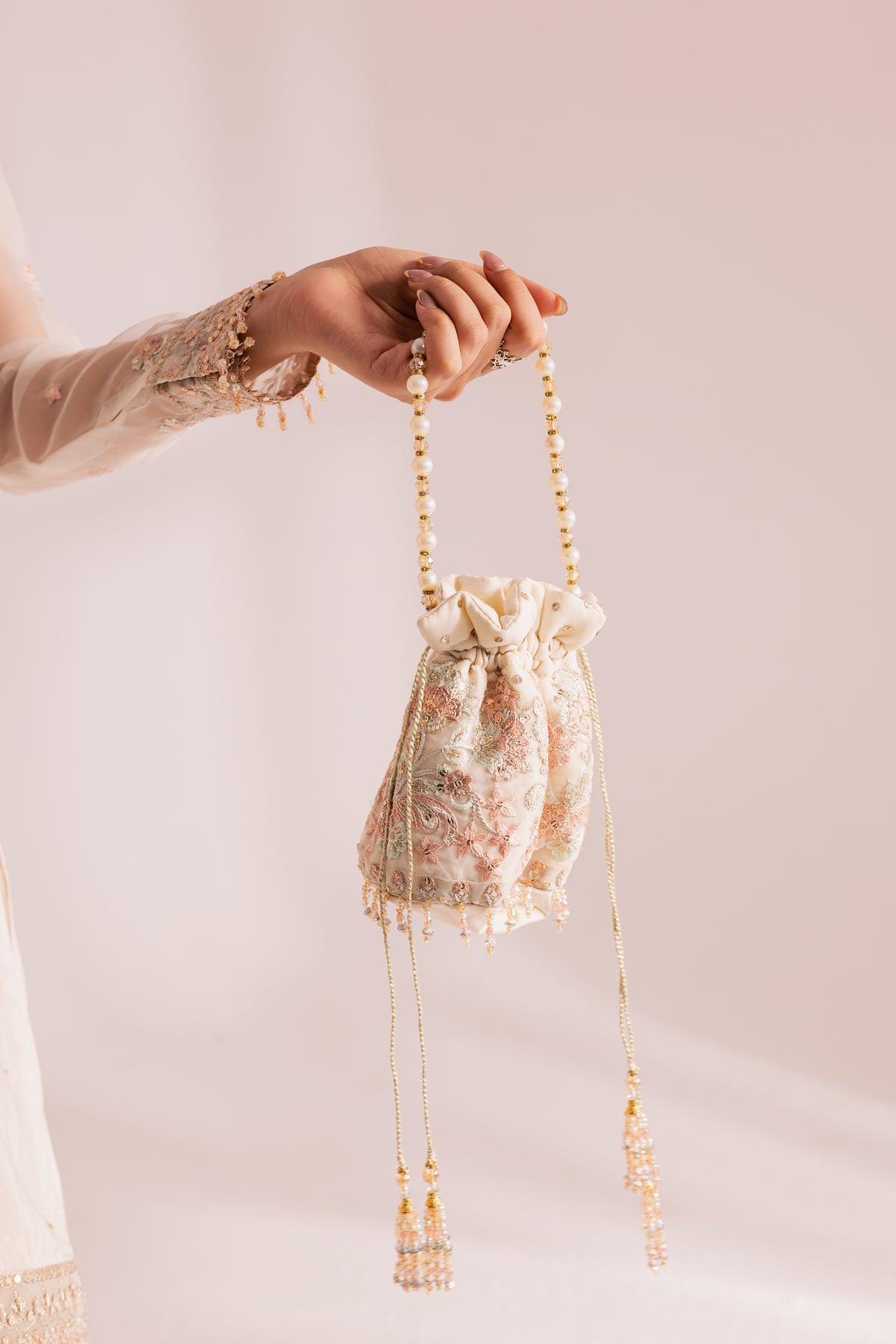 This  luxurious ensemble featuring a pearl white raw silk shirt, gracefully divided into three panels with delicate spread embroidery. The neckline is adorned with hand-embellished motifs in soft pastel tones, complemented by crystal tassels that add an opulent touch. The hem is finished with an embroidered border and sparkling crystal hangings. Organza sleeves mirror the elegance of the shirt, showcasing soft embroidery and bordered cuffs with crystal finishing for added charm.