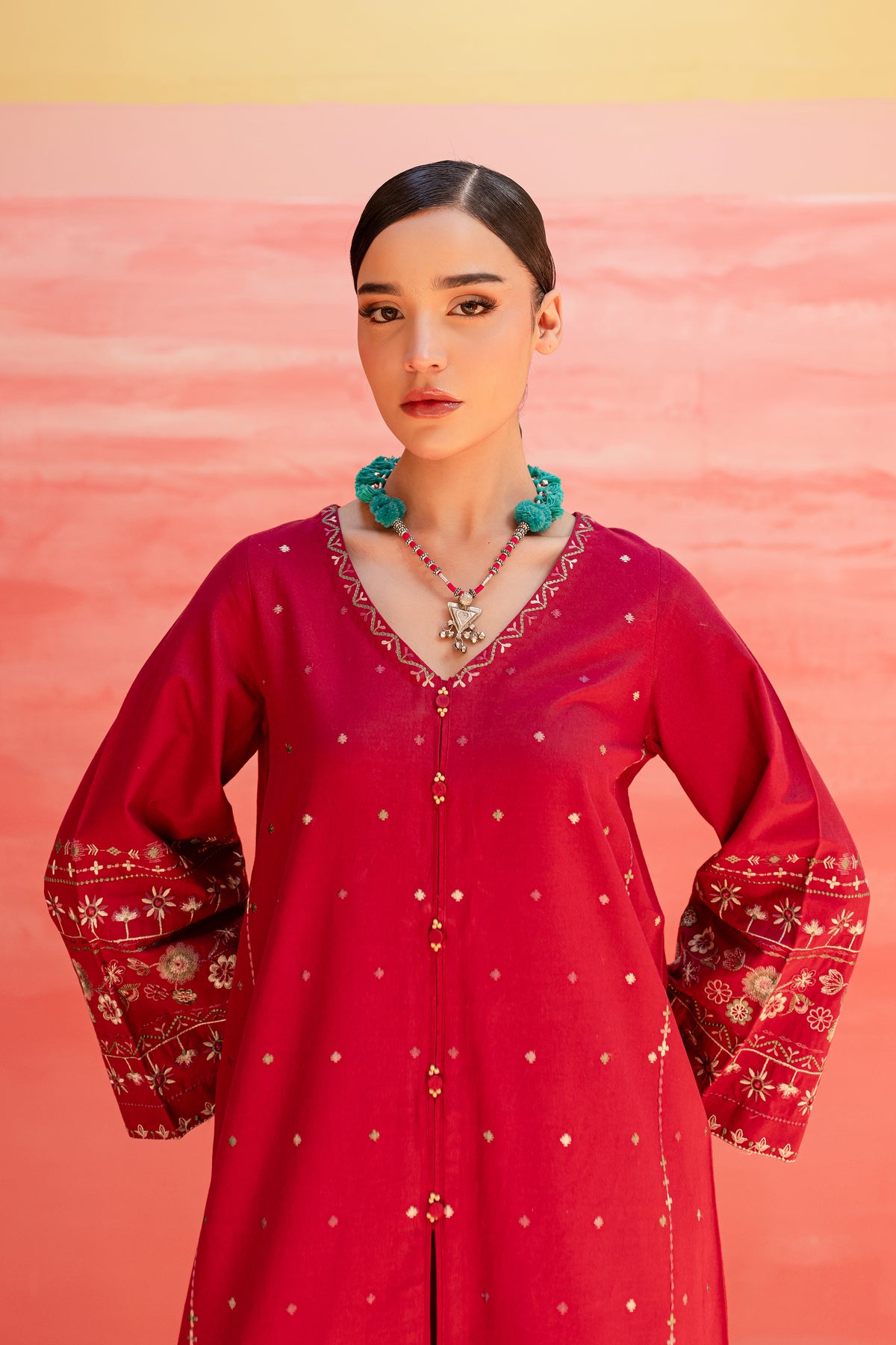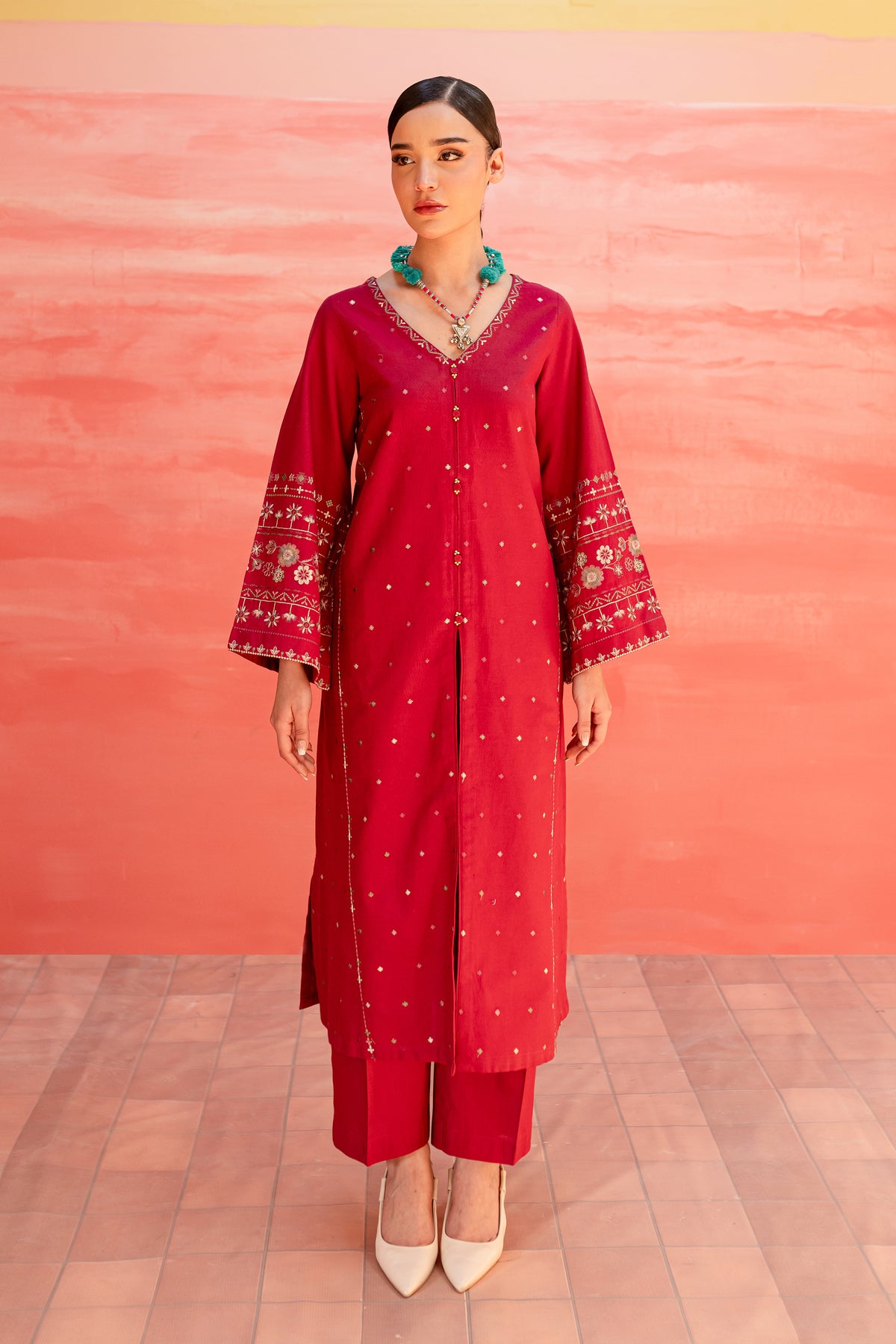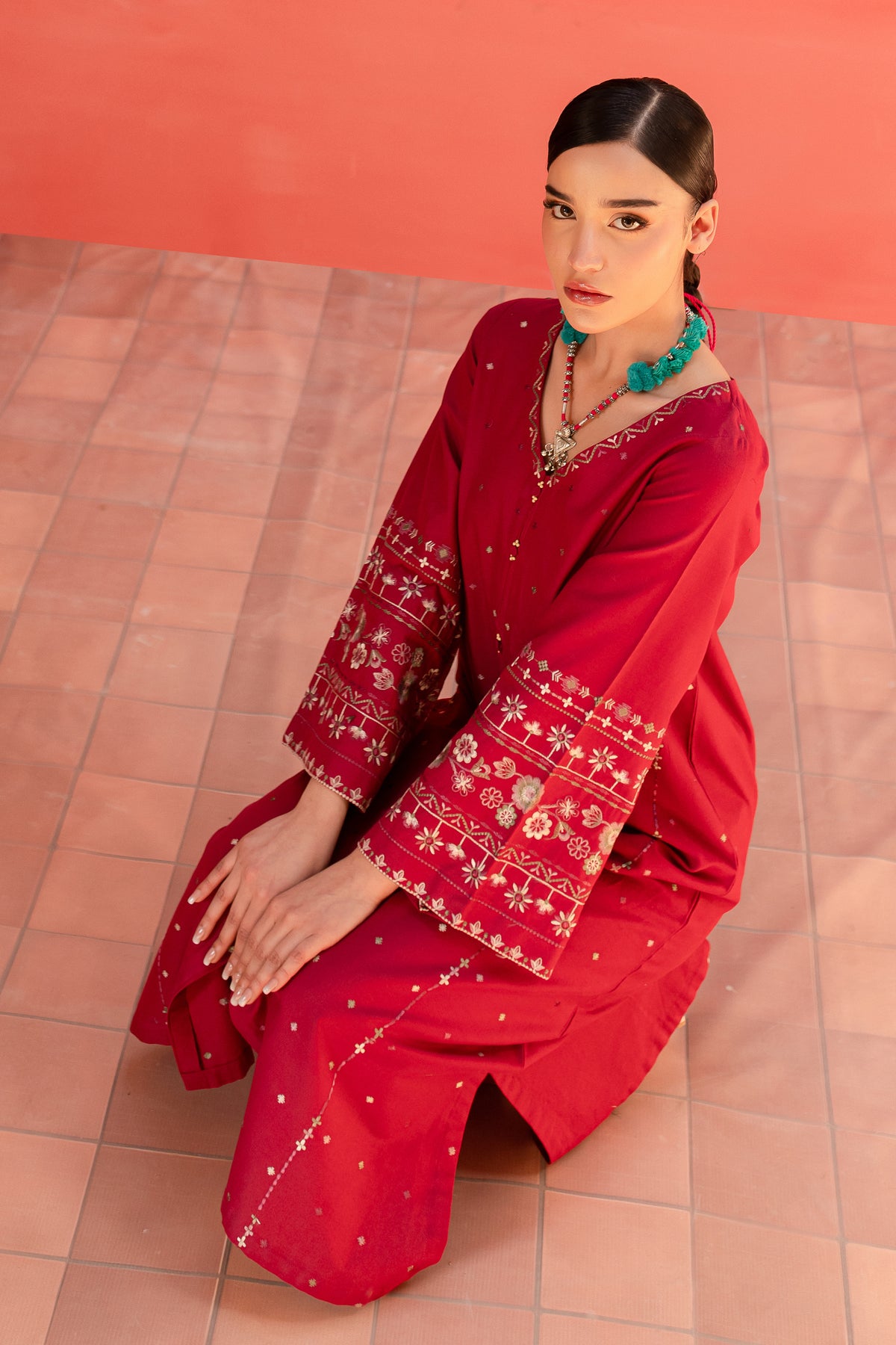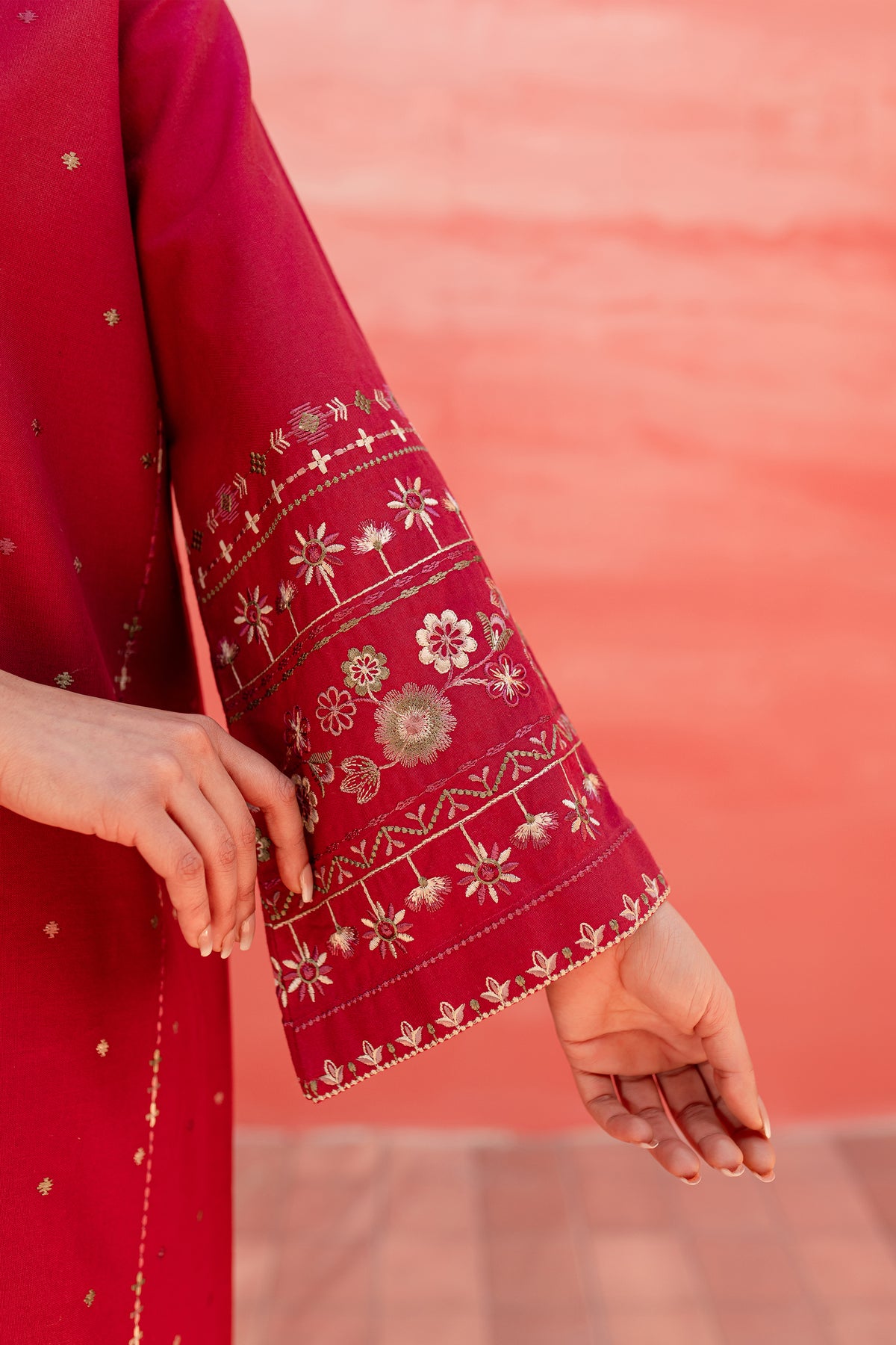 Effortlessly stylish, this embroidered khaddar 2-piece set combines modern design with subtle elegance. The fuschia pink front-open A-line shirt features minimal spread detailing and contemporary repeat embroidery on the sleeves, adding a touch of sophistication and craftsmanship.