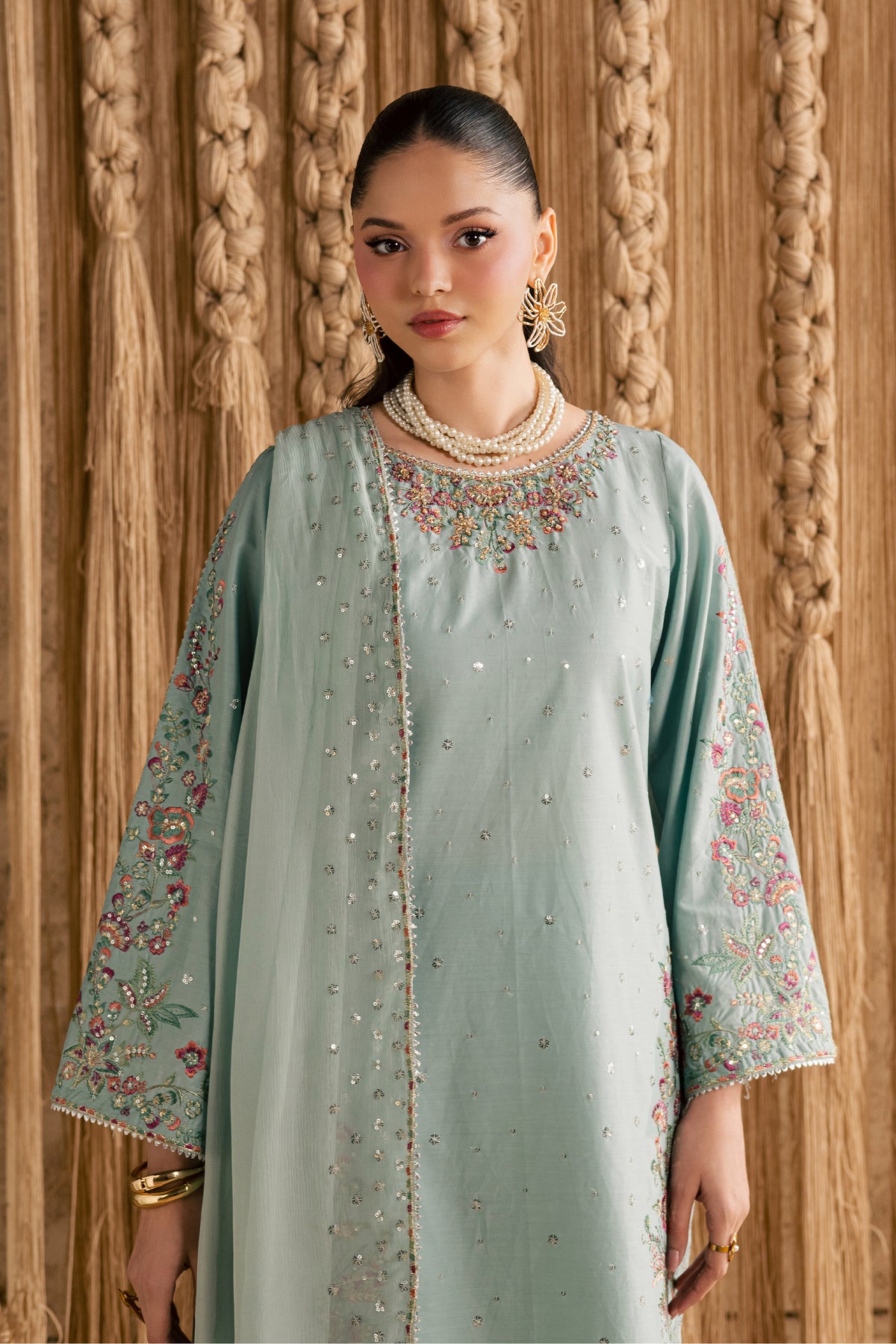 A straight long Ice Blue shirt adorned with composed embroidery across the front, elevated with intricate adda detailing along the neckline. Sequin-embroidered organza patches on the side panels introduce a refined shimmer, while the heavily embroidered flared sleeves add graceful depth.