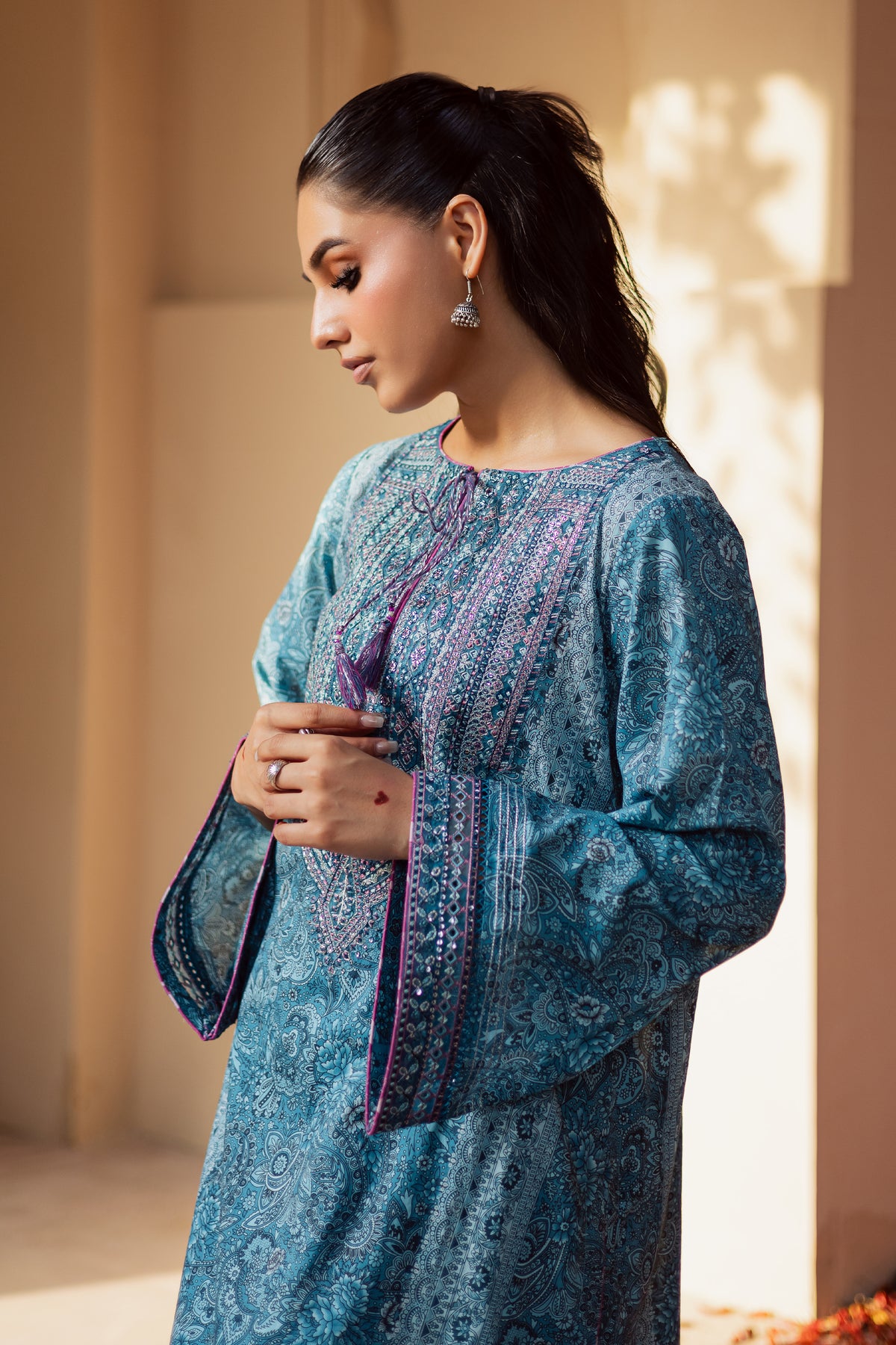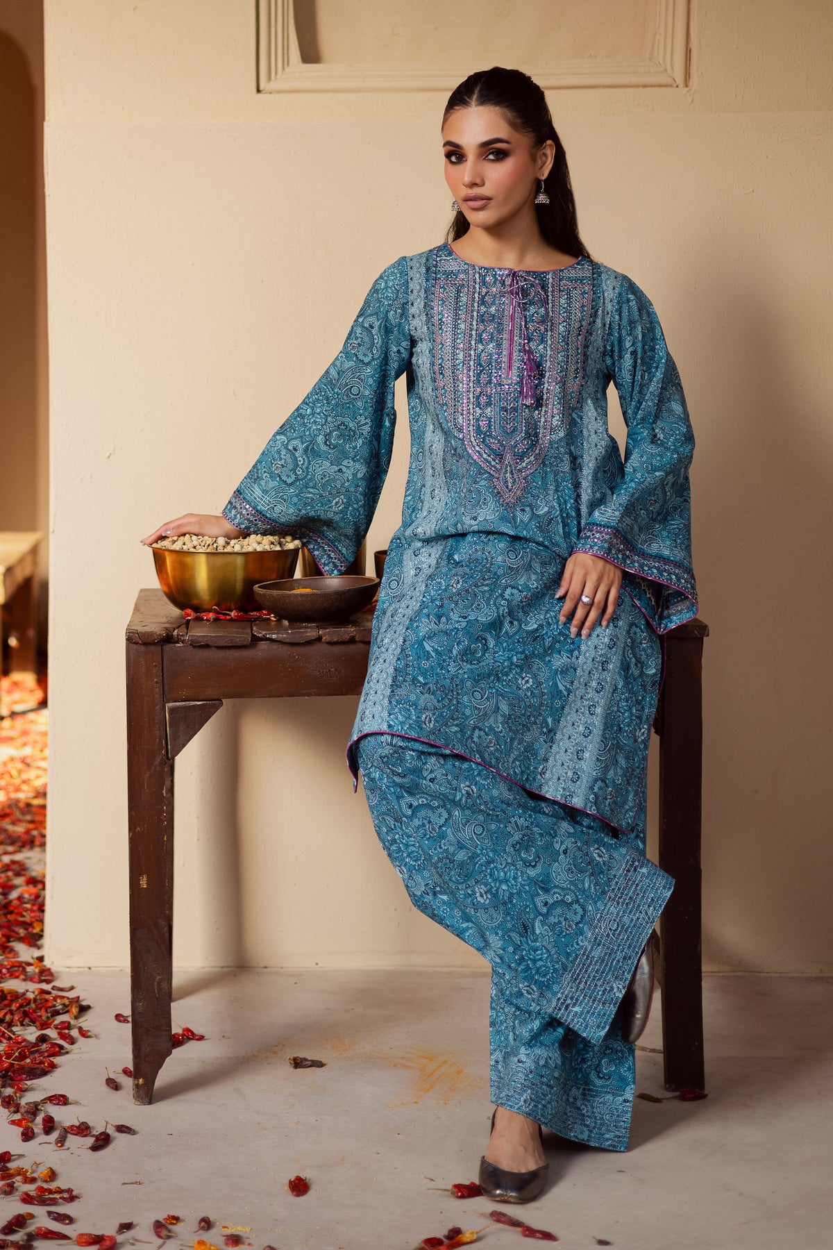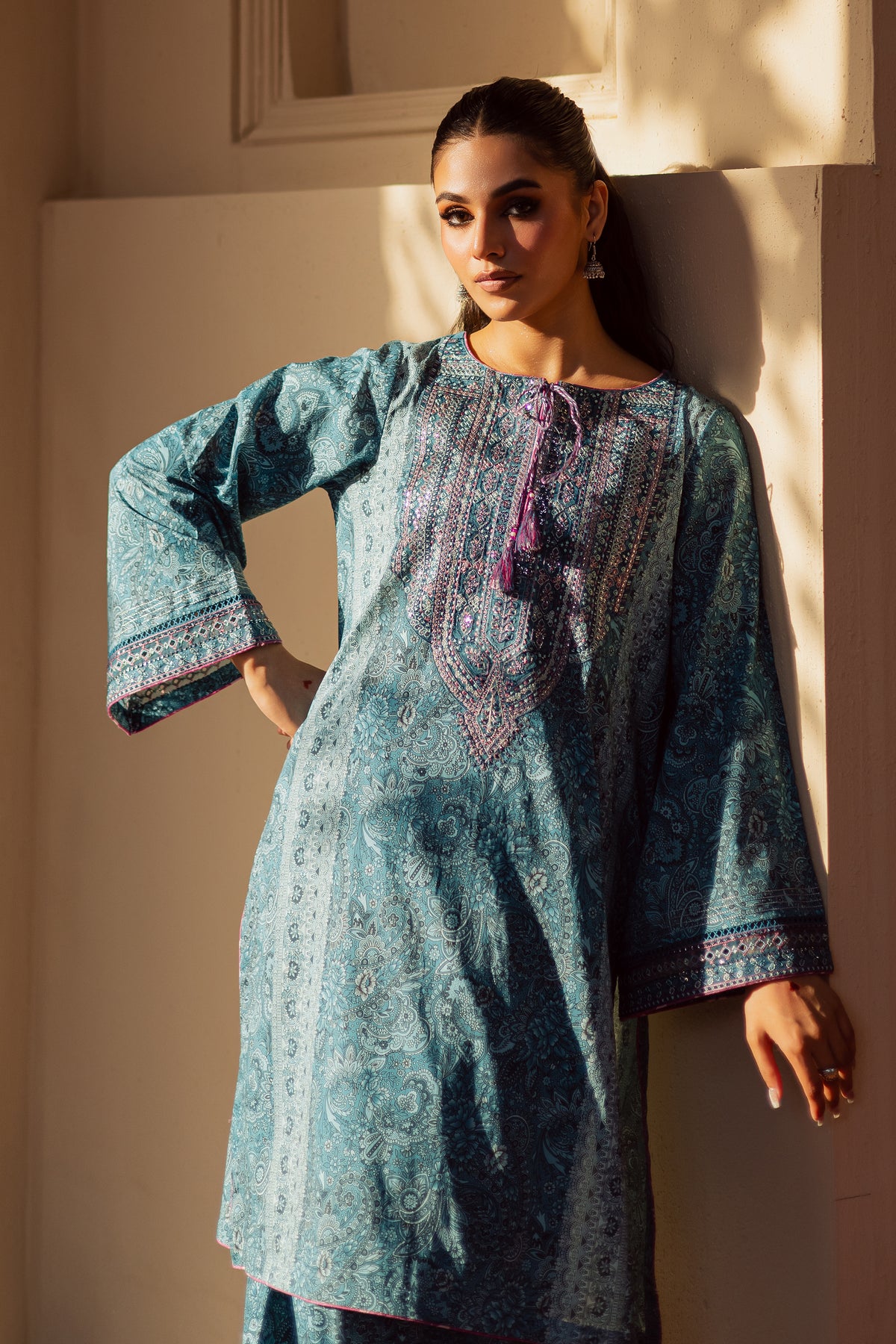 This classic traditional blue lawn shirt features a beautifully printed shalwar kameez adorned with intricate embroidery for an elegant finish. Designed to blend comfort with sophistication, this ensemble is perfect for celebratory occasions or elevated everyday wear. Contrasting piping along the neckline and sleeves adds a refined edge,