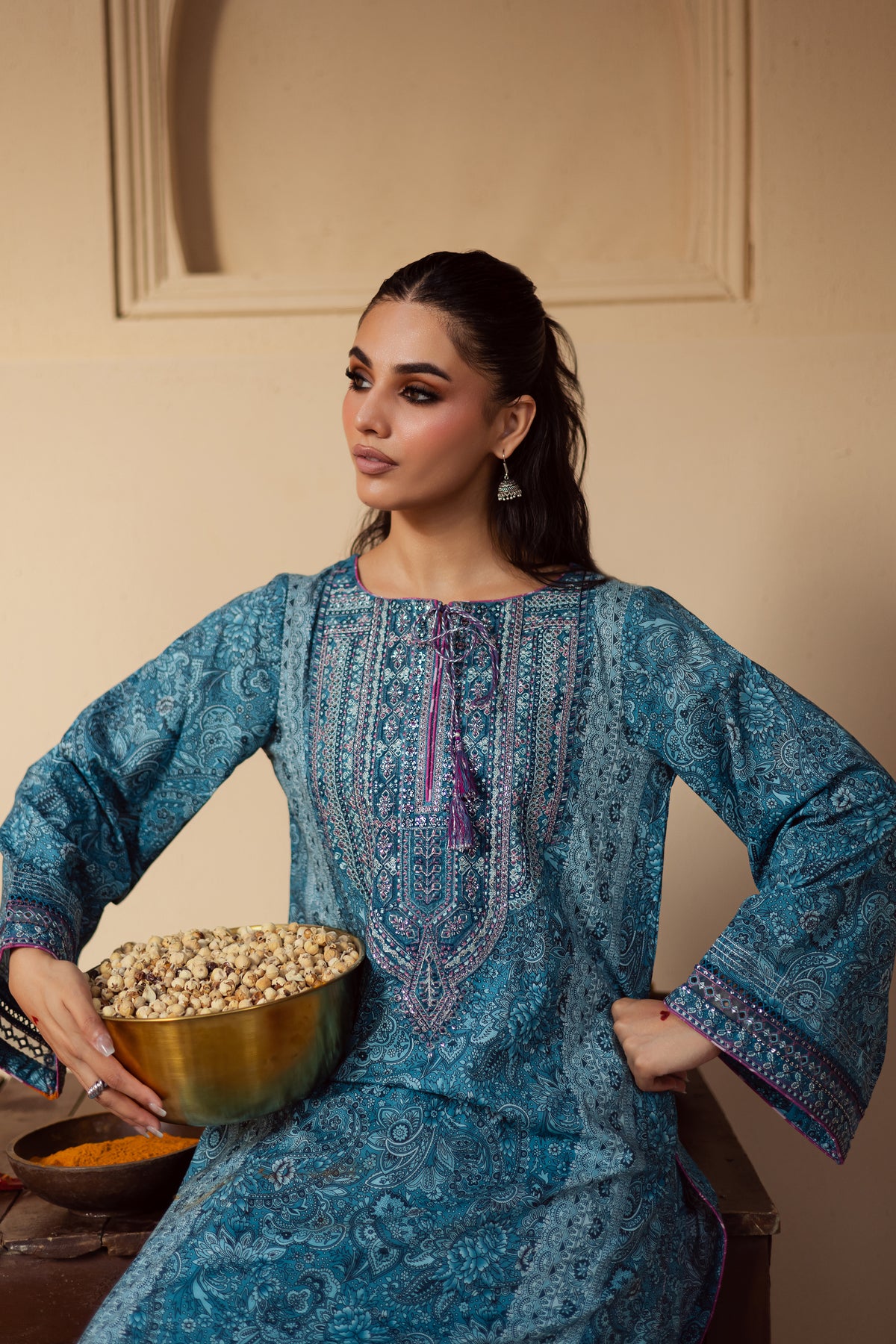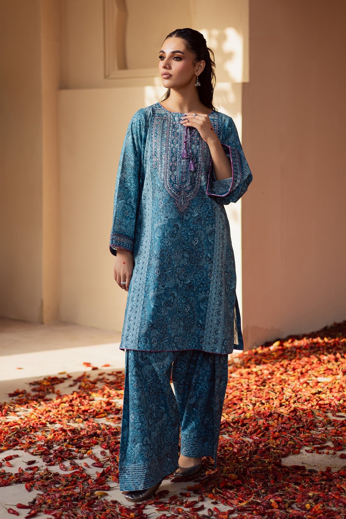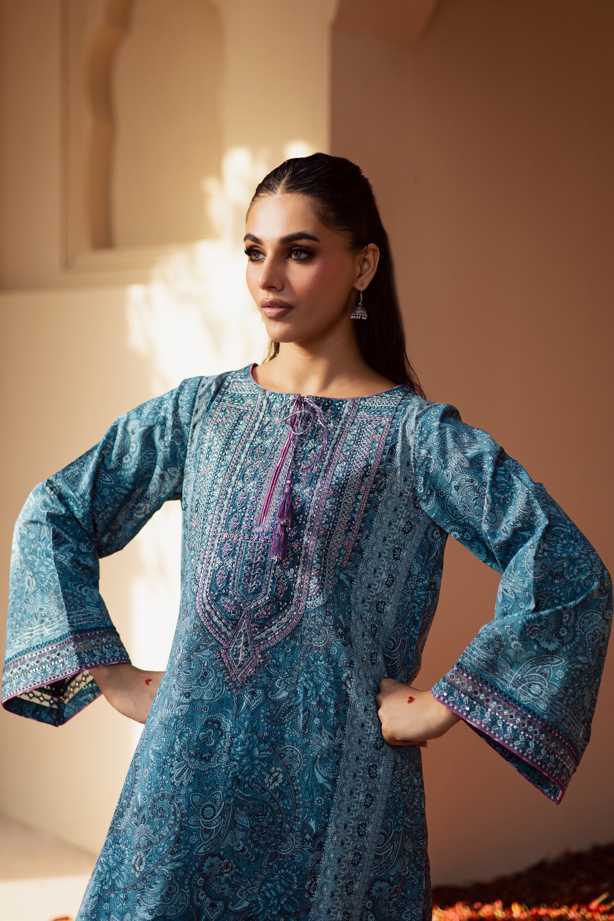 This classic traditional blue lawn shirt features a beautifully printed shalwar kameez adorned with intricate embroidery for an elegant finish. Designed to blend comfort with sophistication, this ensemble is perfect for celebratory occasions or elevated everyday wear. Contrasting piping along the neckline and sleeves adds a refined edge,