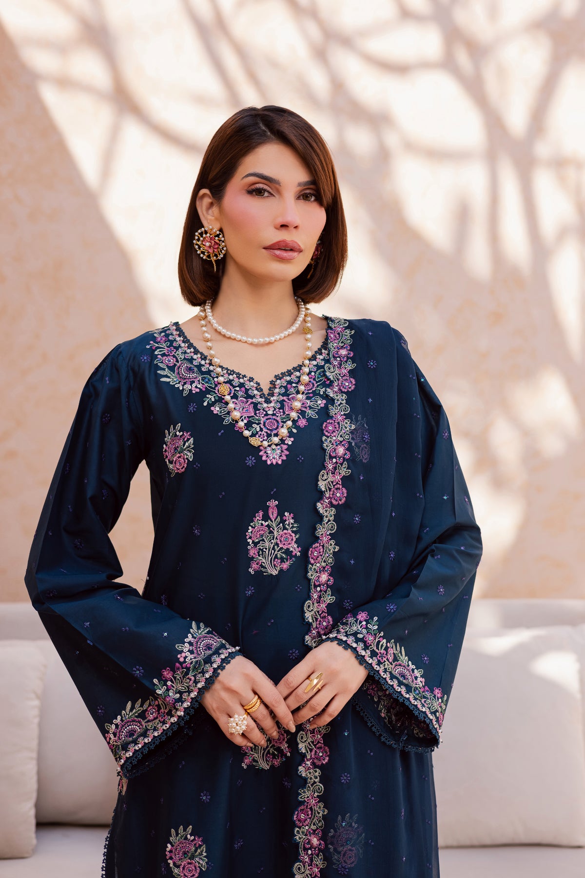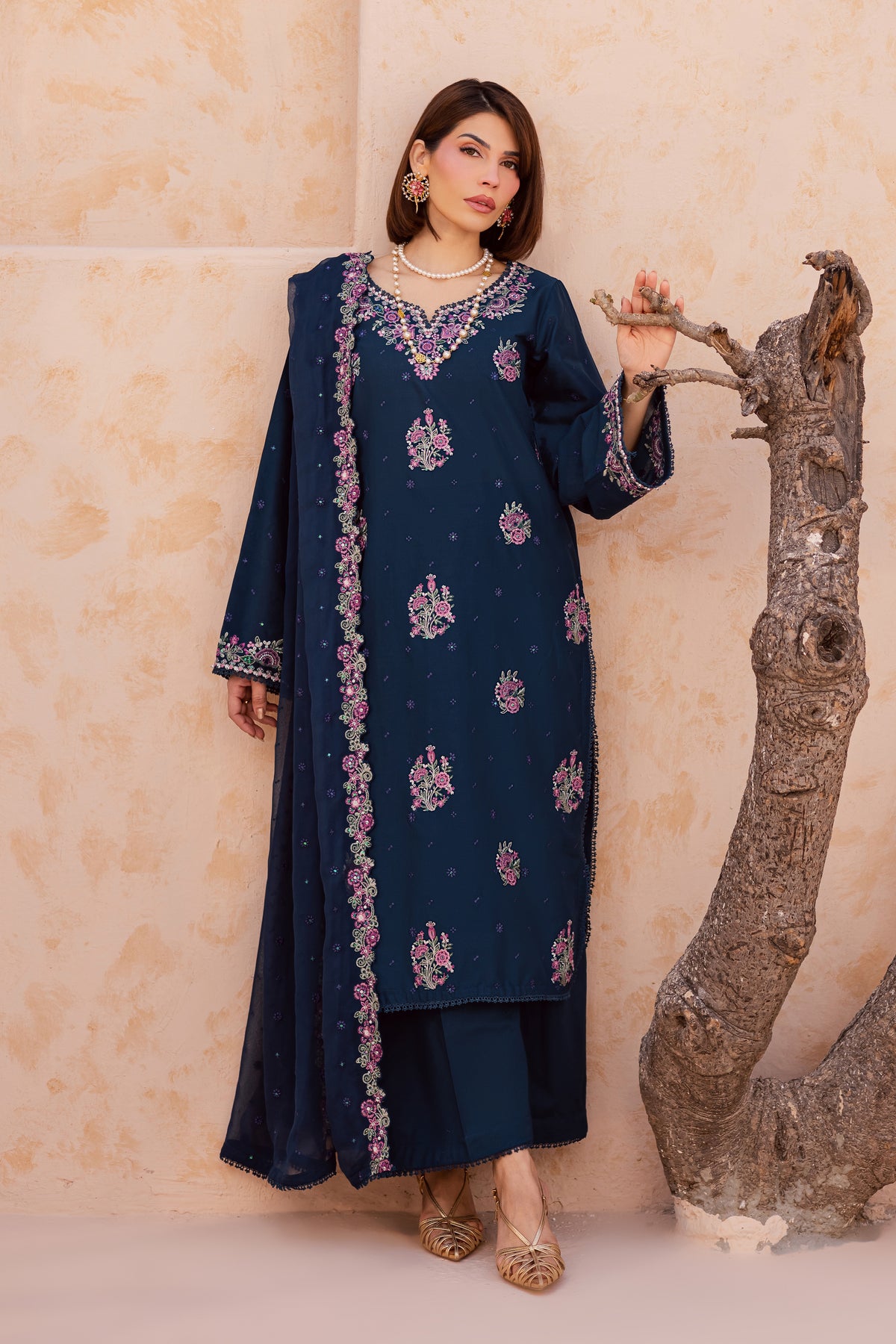 This three-piece ensemble features a floral embroidered shirt with sleeves, designed with a beautifully composed neckline and delicate floral bunches that adorn the shirt front and sleeves, creating a refined and graceful festive silhouette.